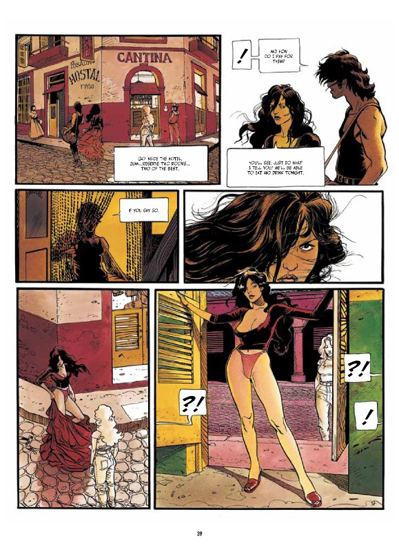 Joroowsky's characterization of Juan as a loyal, angry brute willing and able to do anything is likewise perfect for the tale as Juan proves, through various actions which must be seen to be understood, he's dedicated to not only be accepted, but exalted amongst his peers. As a reader of this terrific tale, I was astonished at how much I loved Juan's character and yet hated him for all the sadistic things he had done (including decapitating his Boss' political opponent, p.58 above and killing his fellow bodyguards for leadership, p. 70 & 71, below).