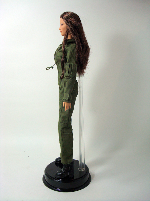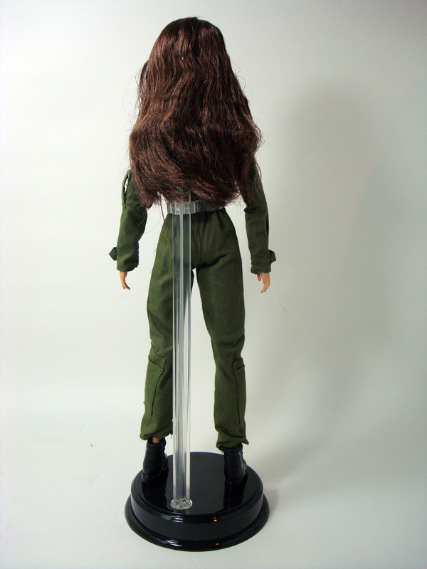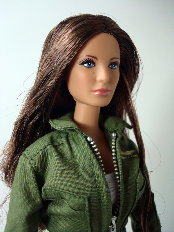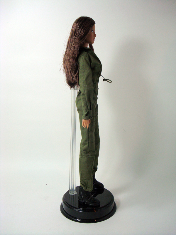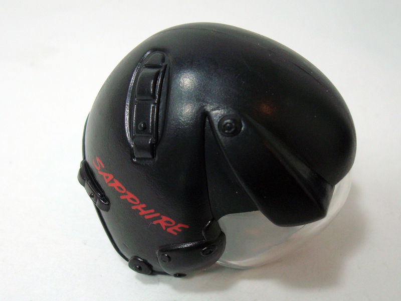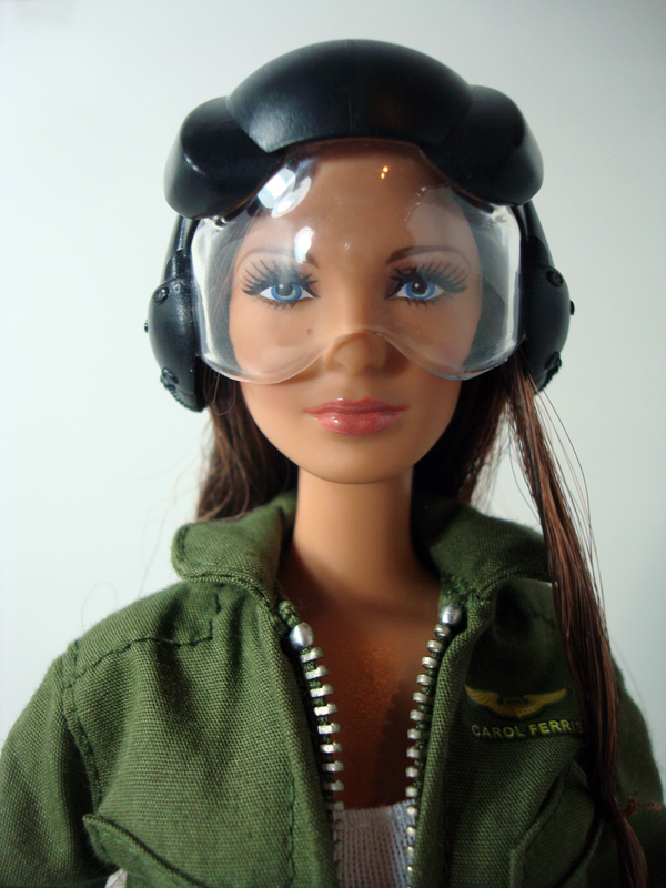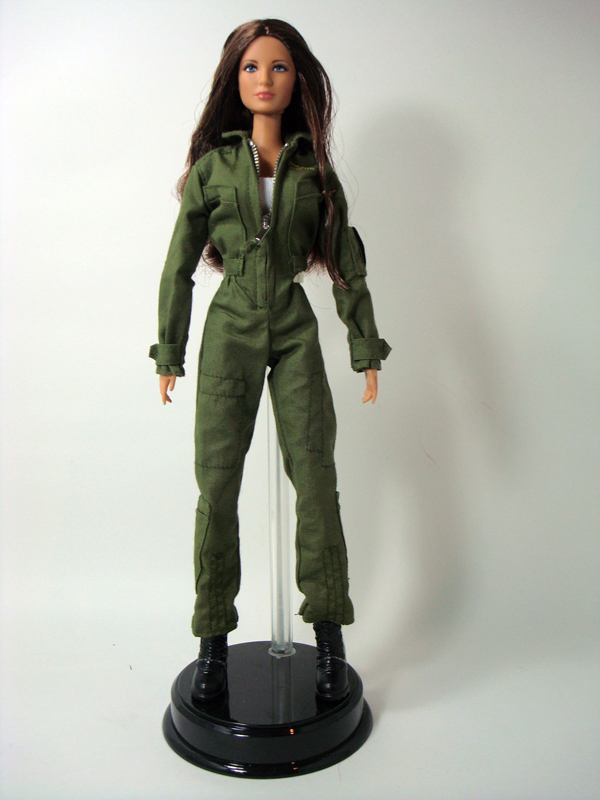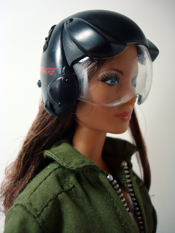 The doll itself is your typical Barbie doll with articulation in the arms, legs, and neck with rooted hair, but this one features a fantastic likeness of actress Blake Lively, from the shape of her chin, nose and eyebrows, to the beauty mark under her eye. The outfit fits extremely well and consists of a zip-up flight suit and undershirt with boots and a wearable helmet. Her flight suit features a transfer of wings and her name “embroidered” on her right breast. The helmet goes on and off easily and features her call sign “Sapphire”, alluding to the fact that she eventually becomes “Star Sapphire”. In addition, she also includes a clear stand for display outside her packaging.