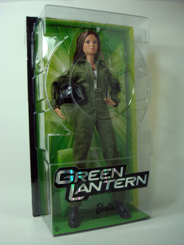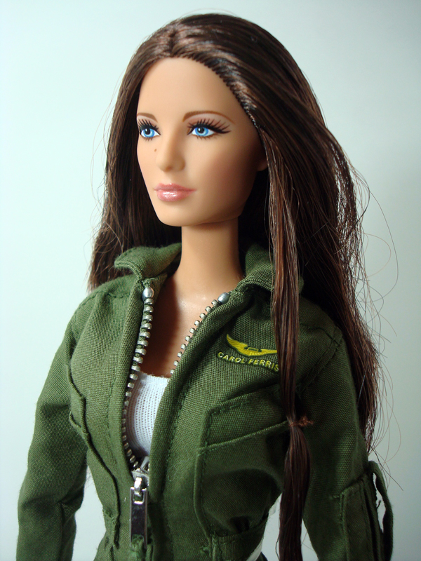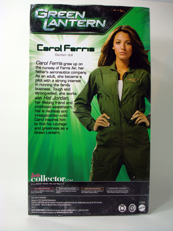 [HR][/HR]Based on her appearance in the 2011 live-action film Green Lantern, Carol Ferris is brought to toy form as part of the Barbie Collector doll line. The character Carol Ferris was a childhood friend and lover interest for Hal Jordan and often flew as a wingman in test runs. An experienced pilot, she went on to become the CEO of Ferris Aircraft when her father took ill. In the comics she was chosen to become a Star Sapphire by the Zamarons and under the influence of evil fought the Green Lantern on many occasions.
