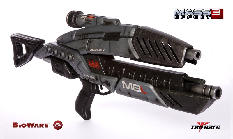 TriForce reveals new photography of their latest weapon replica: the M-8 Avenger Assault Rifle as seen in BioWare's upcoming video game, Mass Effect 3. First introduced in Mass Effect 2, the M-8 Avenger borrows the sleek futuristic curves of its M-7 predecessor, but packs a meaner punch. This life-size 1:1 scale prop replica measures 34" in length and weighs in at 20 pounds. Aside from its precise sculpting details, the M-8 is made even more authentic with the addition of brilliant working LED lights.