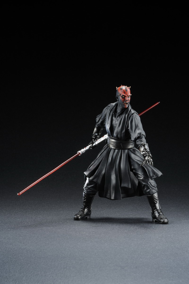 The Sith Lord wears his unique layered black robes, open at the waist to allow the martial artist plenty of freedom of movement in his acrobatic attacks. Maul crouches in a sideways stance, presenting the smallest cross-section of his body to his enemies. His exact pose is up to you; with multiple interchangeable arms and heads you can display your Dark Lord in a variety of configurations with hands and lightsabers held up or down, and with a scowling face or a vicious snarl.