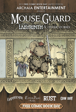 This Free Comic Book Day, Archaia offers readers the chance to experience history in the making with a FREE, gorgeous, 48-page, 6” x 9” full color hardcover original graphic novel featuring all-new material. David Petersen returns with an all-new Mouse Guard tale that’s guaranteed to tug at your heartstrings. Lose yourself once again in Jim Henson’s amazing world of Labyrinth, featuring a fantastical story from Eisner Award-nominee Ted Naifeh (Courtney Crumrin) and Cory Godbey (Fraggle Rock). Get a new perspective on Jet Jones in Royden Lepp’s critically acclaimed Rust, with a short story seen through the eyes of younger brother Oswald Taylor. Jeremy Bastian’s acclaimed Cursed Pirate Girl hits the high seas in this whimsical, swashbuckling tale of wonderland journeys and unimaginable dangers. Nate Cosby (Pigs) and Chris Eliopoulos (Franklin Richards) present Cow Boy, a comedy/western that tells the tale of a young bounty hunter determined to send his entire outlaw family to jail. And Jim McCann and Janet Lee follow up their Eisner Award-winning Return of the Dapper Men with an all-new short story that leads into the upcoming sequel, Time of the Dapper Men. Witness the origin of a new, major character! And…the return of 41?!