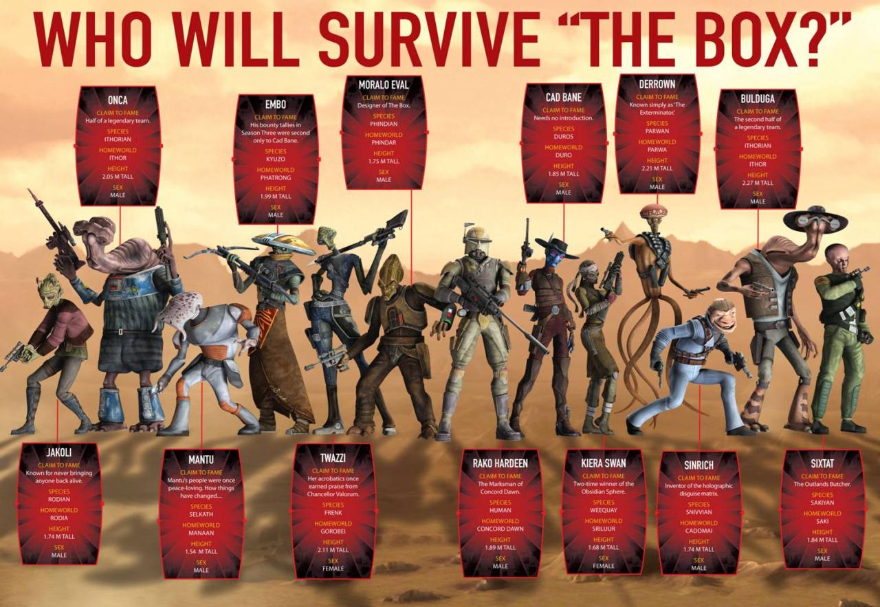 [HR][/HR]Which bounty hunters will be the last ones standing? It’s a tournament of champions, Star Wars-style, in the next all-new episode of The Clone Wars. Obi-Wan Kenobi is still deep undercover as the criminal marksman Rako Hardeen, and he’s done such an impressive job that he’s qualified for Count Dooku’s ultimate test: surviving the Box.