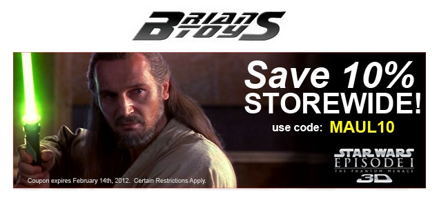 To celebrate the re-release of The Phantom Menace in 3-D, Brian's Toys is having a STOREWIDE 10% OFF sale on all orders placed between now and February 14th, 2012. There is no minimum or maximum purchase. Hurry, because this sale ends soon!