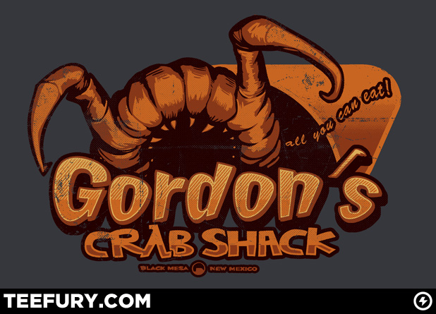 Heads up Half-Life fans, today's original TeeFury.com t-shirt design pays homage to the game's pesky Head Crabs. Created by artist "bisqueets," this extra-dimensional "seafood" buffet is aptly called "Gordon's Crab Shack" (located in Black Mesa, of course).