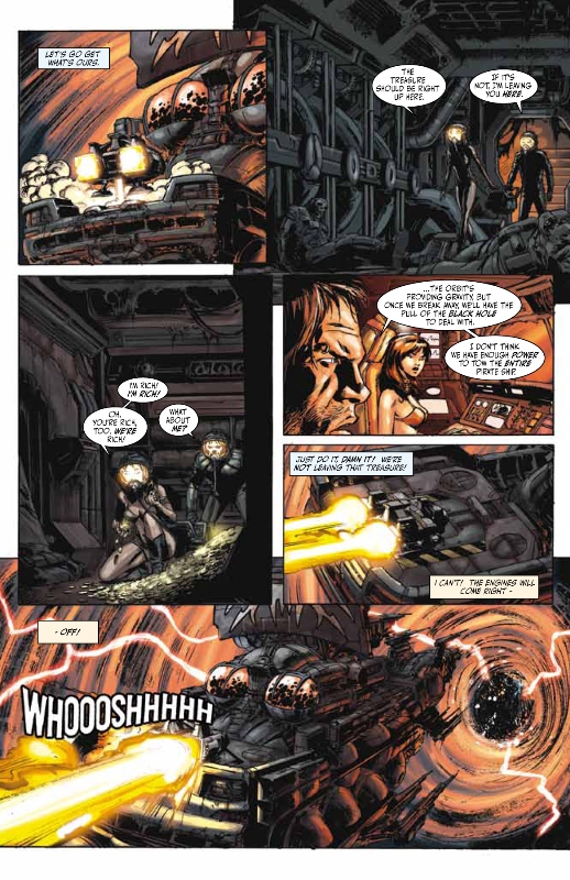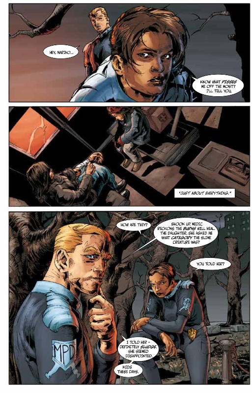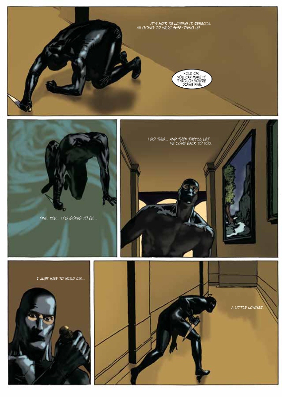 The sci-fi excitement continues in artist Mark Vigouroux and writer Dan Curtis Johnson's spy thriller, Rapid Eye Movement (below). Swift, silent, and deadly doesn't even begin to explain what type of assassin is featured in these pages! With a unique tale that spans 8 pages, readers find themselves watching a trained assassin killing high valued targets...without knowing what he's doing or why he's doing it!