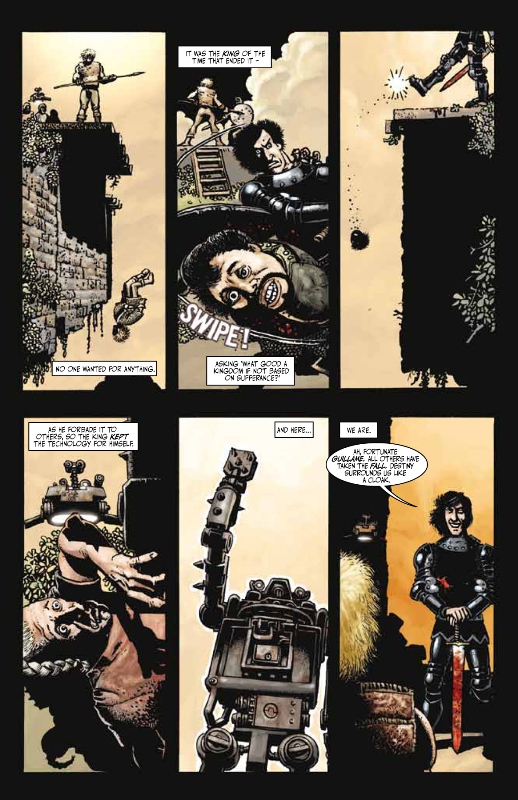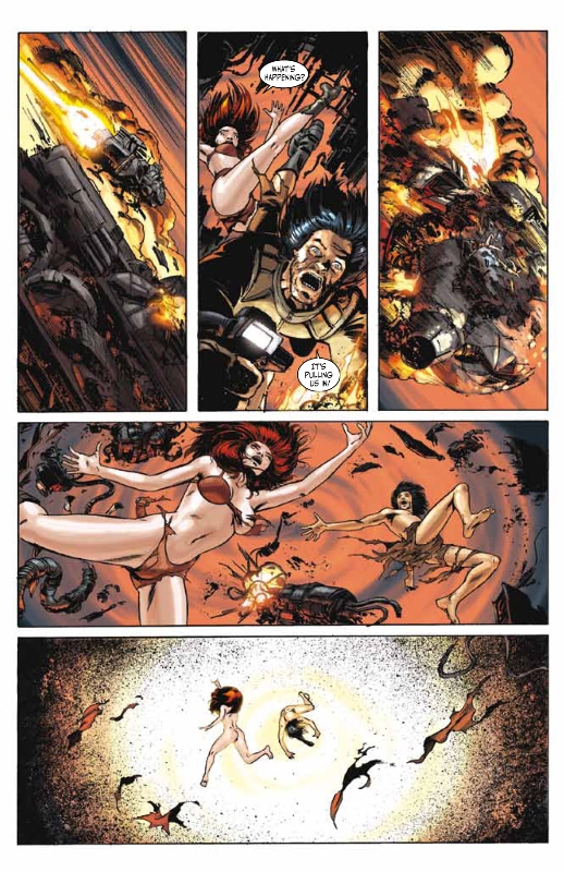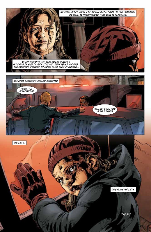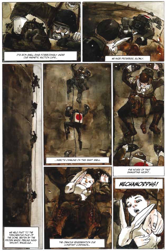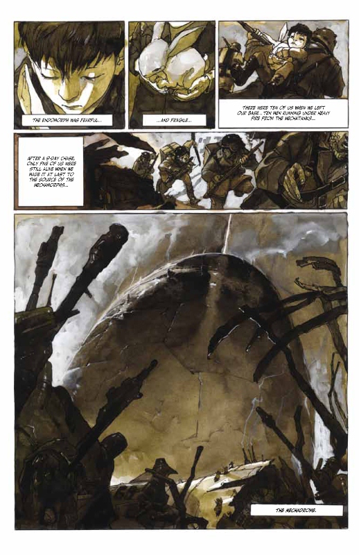 One of my personal favorites, Endomorph (below) by artist/writer Stephane Levallois is the most unique, fun, and frightening tale in the entire book. The story tells the tale of a squad of soldiers, a child, and a rabbit as they enter hostile territory to uncover a secret weapon that's unlike anything else I've ever seen. With an ending that'll have you wishing the 8 page story was much, much longer, Endomorph is exactly the type of sci-fi that makes anthologies like this worth picking up!