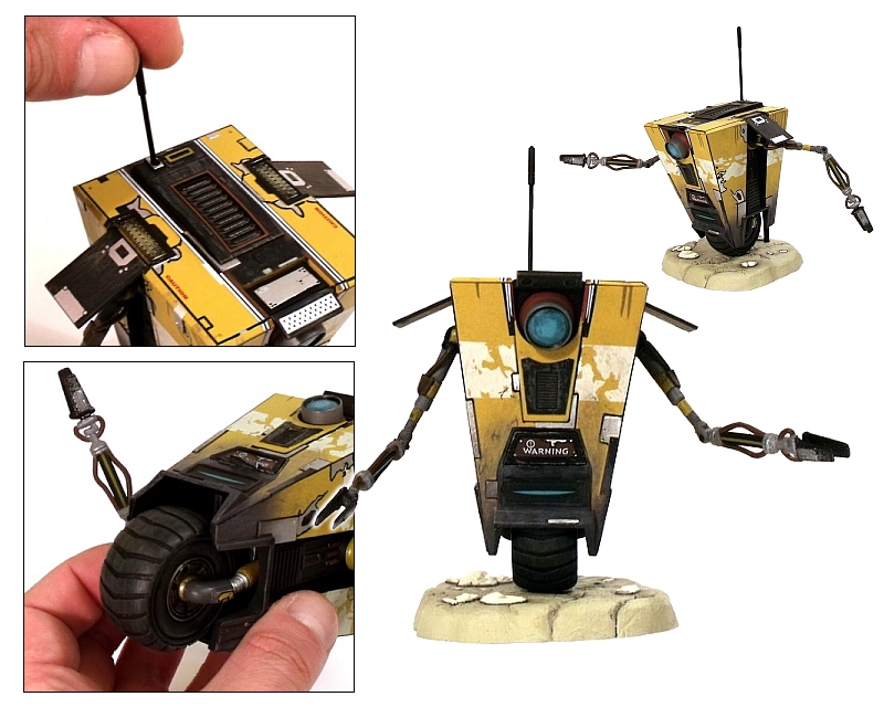When not dancin', Claptrap comes with a display base that resembles a piece of Pandora's vast desert. Simply plug the included plastic black rod into Claptrap's back and into the hole on the base and voilĂ*!, it's display time. Sadly, the much talked about sound feature on Claptrap was omitted. Hopefully, if sales are good, we'll see a talking Claptrap in the future. I never say never because hey, who would have thought we'd get a BioShock Big Daddy Bouncer with a light-up LED feature? Think positive and buy many Borderlands figures - anything is possible!