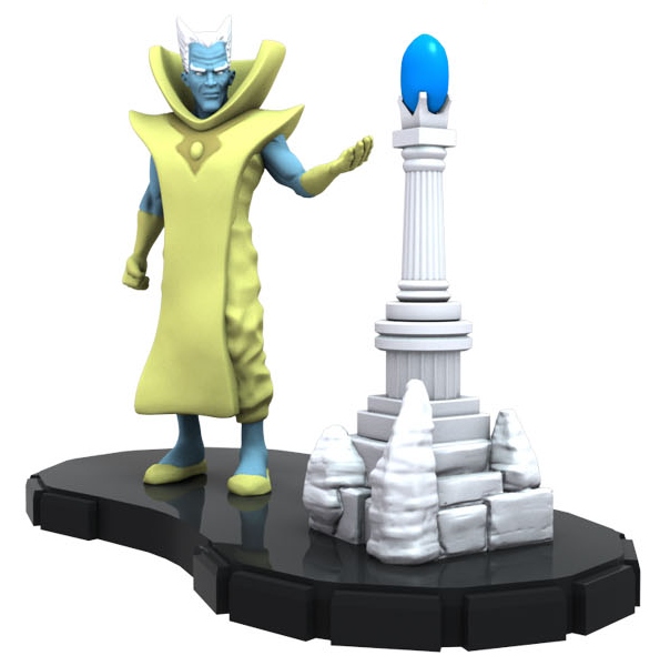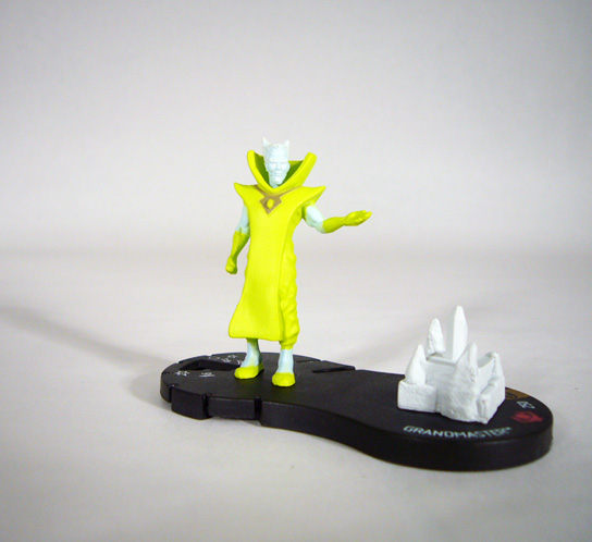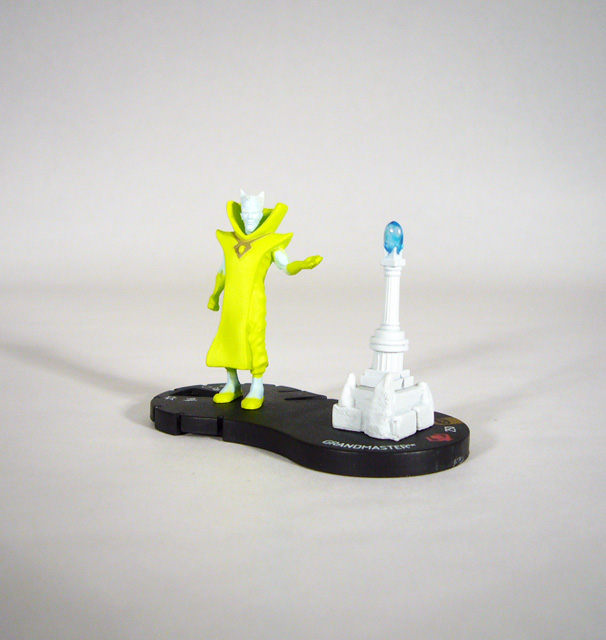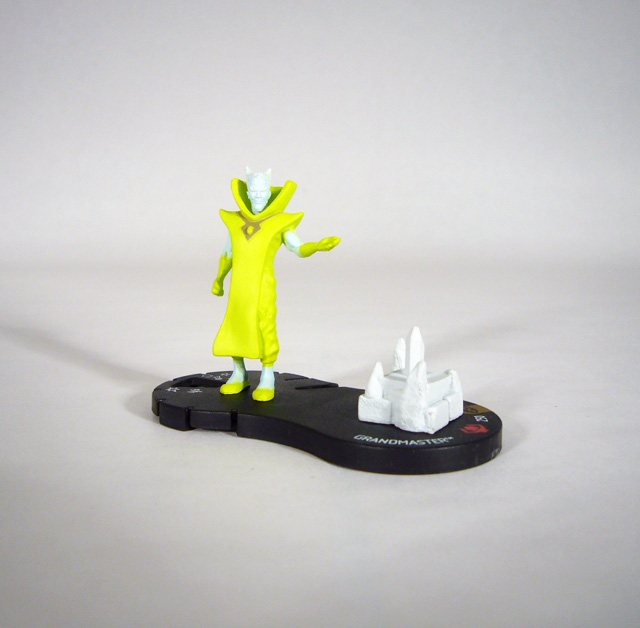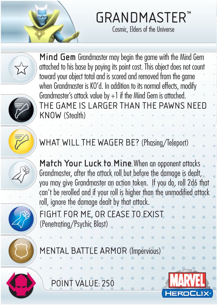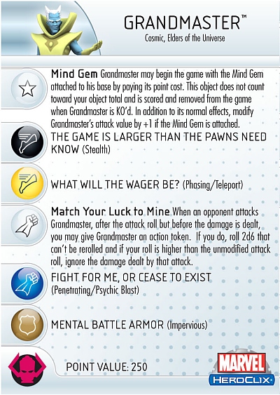One of the more powerful of the Elders of the Universe, the Grandmaster costs 250 points. Like the rest he has the Power Cosmic Team Ability so he can act two out of every three turns and doesn’t have to worry about Outwit. His double-sized base has a built-in post for the Mind Gem, and he can start the game with it attached so long as you pay its cost (and gets a solid +1 to his attack for doing so!). The Grandmaster brings solid numbers to the table and a host of great powers. Opening Stealth lets Gast attack from the shadows, and it overlaps with his special power “Match Your Luck to Mine” that lets him try to avoid getting hit by attacks. After two clicks Grandmaster swaps that out for Penetrating/ Psychic Blast, though it returns on his final three clicks.