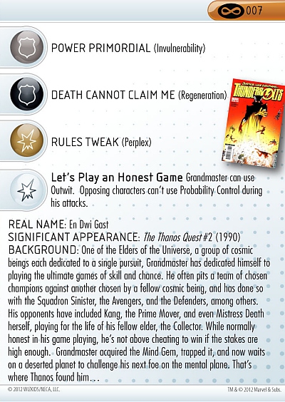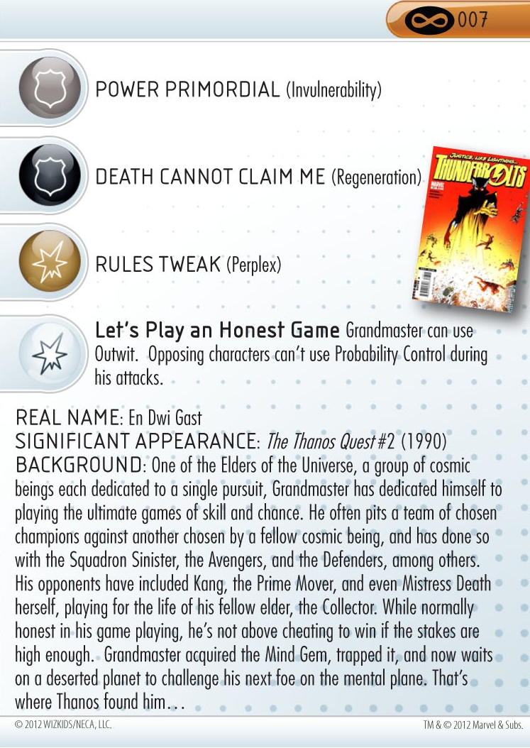 On the defense track the Elder alternates between Impervious and Invulnerability for much of his dial, switching to Regeneration at the end to get back into the game. Those final clicks also have Phasing/Teleport so he can escape from battle to heal. Grandmaster has two Damage track powers that alternate on every click: the ever-useful Perplex and the special power “Let’s Play an Honest Game” that grants him Outwit and protection from opposing Probability Control!