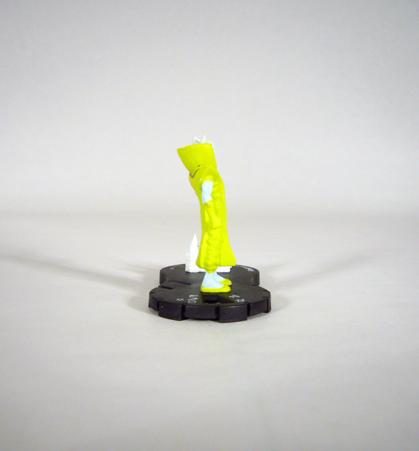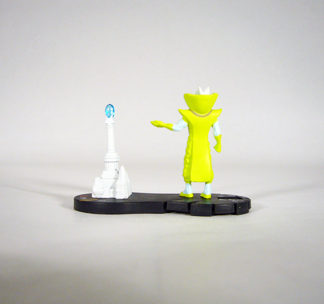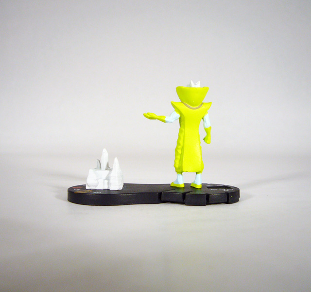 The Grandmaster resembles the Collector, both of them being small blue men with strange outfits. Slightly taller than his fellow Elder at 1 ¾ inches tall or so, Gast stands in a regal pose with one arm outstretched as if summoning his latest game pieces or making his next move. The Elder wears a decorative robe with a thick front panel, flared shoulders, and another huge collar. His colors are a bit more muted; the Grandmaster’s blue skin and white hair contrast nicely with the light green of his costume with its matching gloves and groovy slippers! The figure has a very good sculpt with the usual special attention paid to his clothing in the form of creases and the decorative neck piece. The Grandmaster’s head is pretty cool too with a stern expression and unique pointed hairdo.