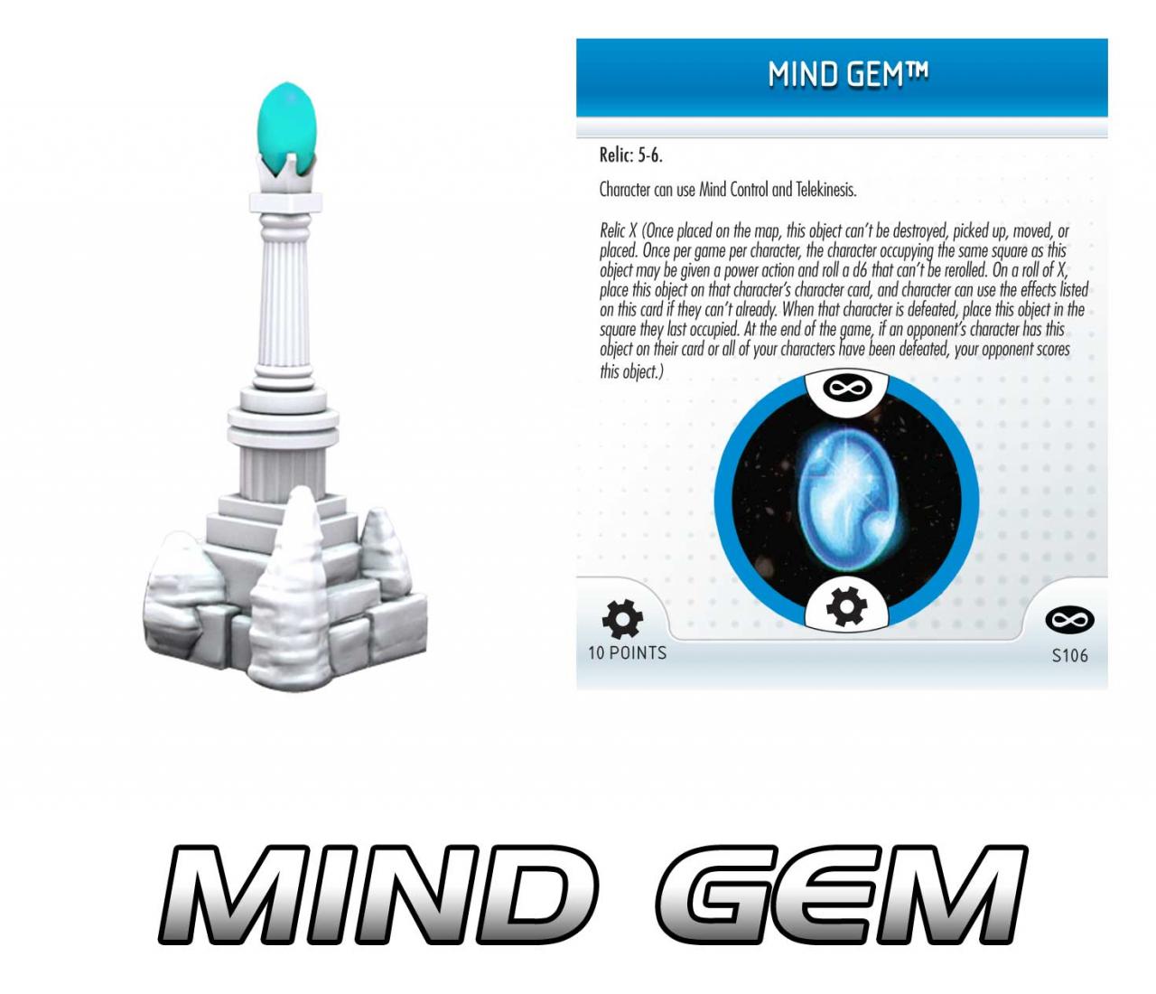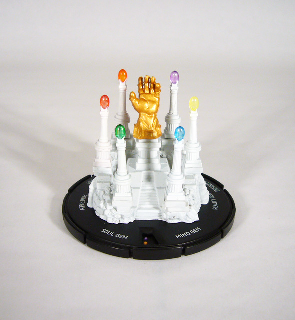 For his part, the Grandmaster was once in possession of the Mind Gem, one of the ultimate relics of the universe. The sixth and final piece to add to your Gauntlet is identical to the others: a translucent “gem” atop a white column-like pillar that stands 1 ¼ inches tall. The Mind Gem is a deep blue that completes the rainbow of green, red, orange, purple, and yellow. When used as a special object on its own, the Mind Gem is a 10 point relic that can be picked up with a roll of 5 or 6. When held it grants its wielder both Mind Control and Telekinesis! As previously mentioned, the Grandmaster can begin the game with the Mind Gem; in addition to its usual powers it also grants him a permanent +1 to attack. Of course you’ll most often see this gem, along with all of the others, attached to the Infinity Gauntlet.