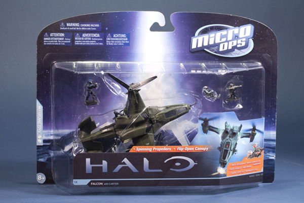 The Falcon (Utility Helicopter-144) is a troop transport aircraft of the UNSC used in Halo: Reach. The Falcon is versatile, multi-purpose helicopter that features rotating propellers. The pack also includes Carter (a member of Noble Team from Halo: Reach), one Spartan Pilot figure and one UNSC Trooper. 4 total pieces.