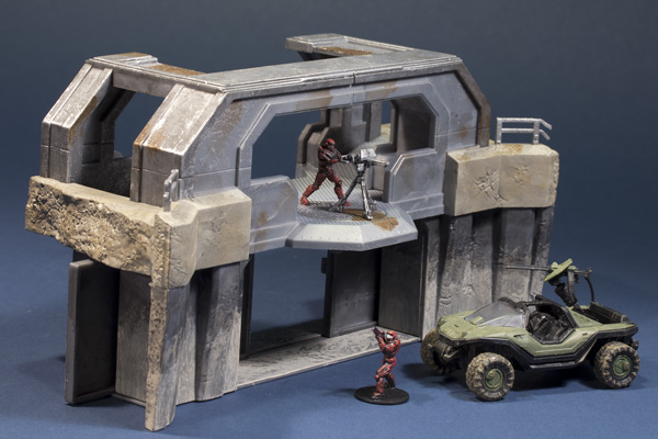 This bunker (also known as a pillbox) can be found located next to an old UNSC base in the High Ground multiplayer map of Halo 3. To replicate the wear of battle, the bunker can be pulled apart and includes a working trap door on roof. Pack also includes a Covenant (enemy) Shade Turret (Type-26 Anti-Infantry Stationary Gun), along with a Spartan figure and a Marine figure. 4 total pieces.