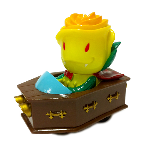 The warmth of the San Diego sun has helped Joshua Herbolsheimer’s vampiric garden bloom a beautiful yellow flower, as the ROSE VAMPIRE CASKET CRUISER tears up the highway on the way to Comic-Con! With a rose head cast in yellow vinyl and a “pinebox derby” coffin cast in wooden brown, this popular toy is decorated with red, green, blue sprays with metallic gold detailing for the handles and headlights. The Chocolate Racer is a high-quality Japanese vinyl figure, approximately 4 inches long, with free-rolling wheels.
