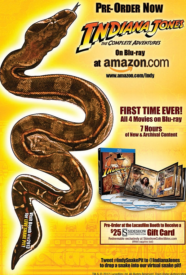 [HR][/HR]The adventures of everyone’s favorite archaeologist - Indiana Jones - are arriving in high-definition Blu-ray for the first time this fall. Fans attending San Diego Comic-Con will have the opportunity to pose for photos with a recreation of the famous Well of Souls scene from Raiders of the Lost Ark, complete with throngs of live snakes! Fans who pre-order the collection on-site will receive a $25 Sideshow Collectibles gift card*. On Twitter, use #Indysnakepit to join the fun in a virtual snake pit.