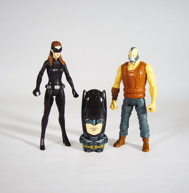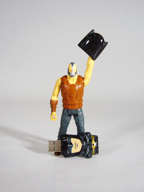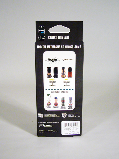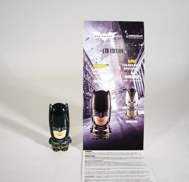 The back of the box shows off some other Mimobots on the market with a note at the top to “Collect Them All!” The insert behind the Flash has a Daily Planet collage, and if you unfold it you’ll find a fun image of him with Superman! For DKR, Mimoco went with something appropriately darker on the same style packaging. The black box with white lettering has a Dark Knight Rises movie logo on the front panel as well as a “LTD EDITION” notation at the very top. The “8 GB” on this box appears in a yellow circle that stands out from the black and white palette. The back of the box also has the same layout, and this time it prominently advertises DKR’s Batman and Bane.