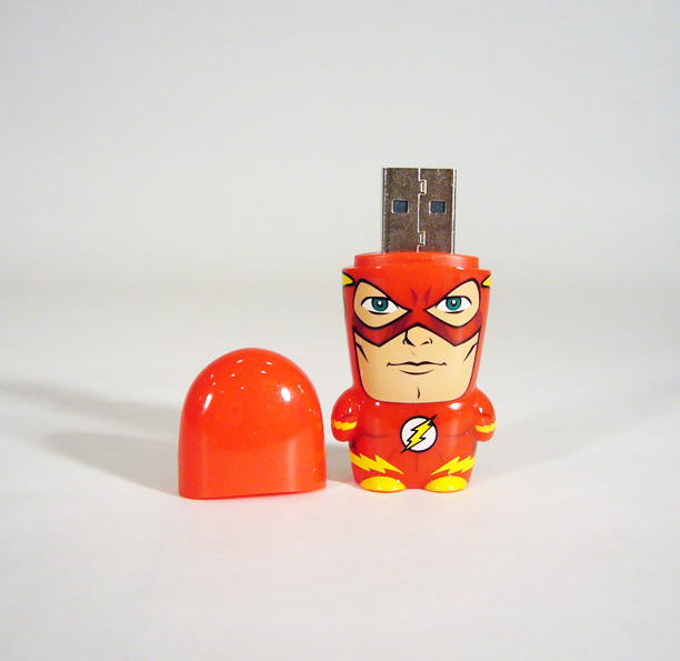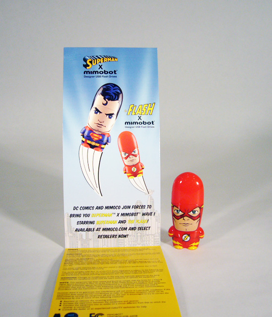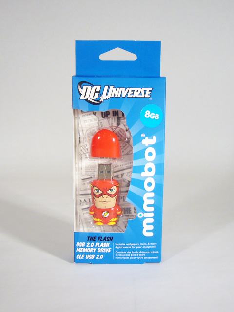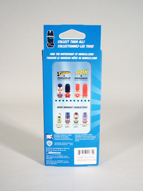 All DC Mimobots come packaged in the same style box, tall and narrow with an open window to see the drive. Flash’s DC Universe box is bright blue with white lettering. The series logo appears at the top, while next to the Mimobot cut out is a starburst pattern that draws in the eye. All of the pertinent info is down at the bottom, while a sticker at the right tells you the storage capacity.