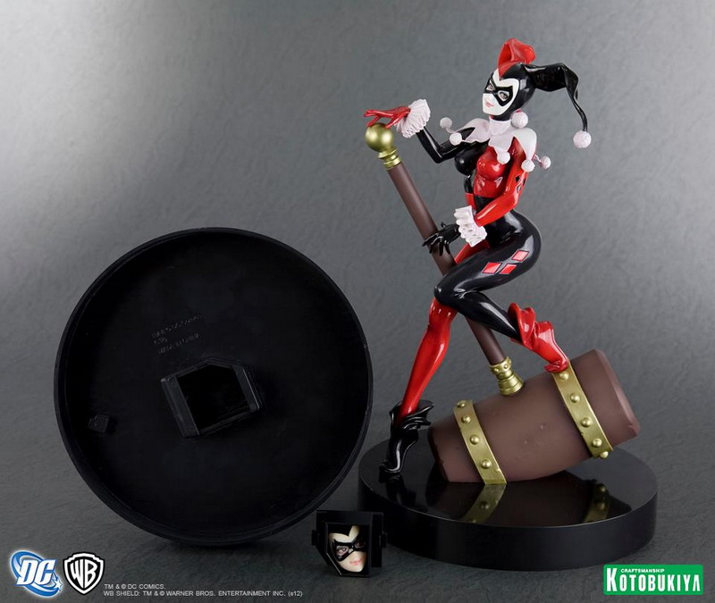 As an added bonus to their upcoming Harley Quinn Bishoujo Statue (read our full story HERE), Kotobukiya will now include two interchangeable portraits (flesh tone and white paint) that can be seamlessly be attached via an embedded magnet. Additionally, the faceplate not being used can be placed in a storage compartment under the base.