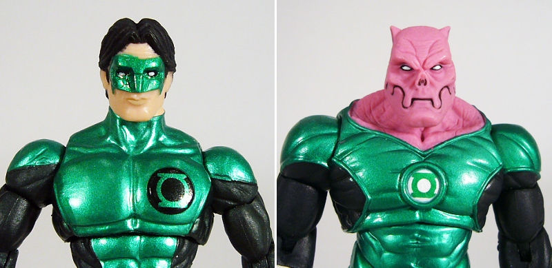 Even with a good sculpt, a figure can be made or broken by its paint job. Thankfully, DC put the care and attention into these figures that their sculpts demanded. Green Lantern uniforms aren’t extremely complicated, so it’s important that the colors are true and distinct. Both figures share the same matte black (upper limbs, abdomens), pure white (gloves) and bright metallic green (boots, chests), cleanly applied where appropriate on their different uniform styles. Kyle adds a pale skin tone with his black hair, green mask, and white eye holes, while Kilowog has a nearly bubblegum-pink head and neck with white eyes. ‘Wog’s GL symbol looks cooler than Kyle’s too with its white and green paint instead of green on black.