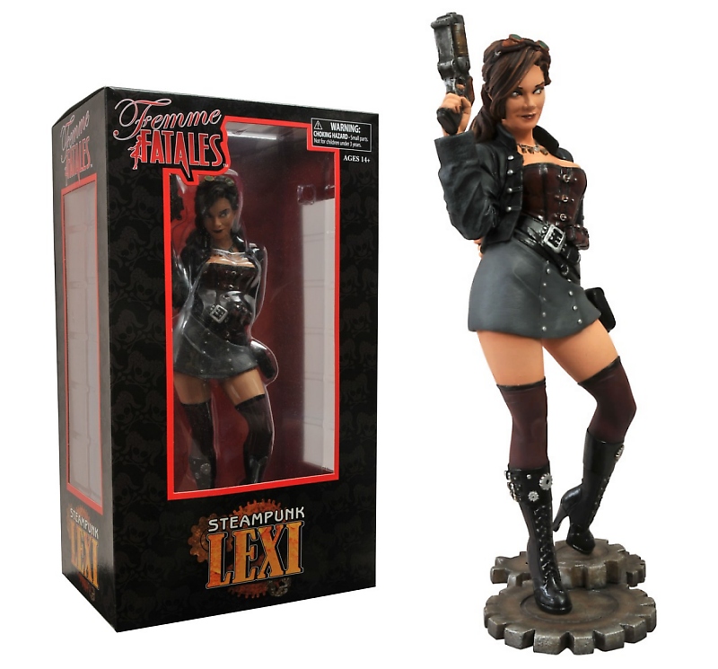 Springing from the thought-tanks at DST, Lexi is dressed in timeless steampunk fashions and wields a deadly-looking pistol. (She may be a modern woman, but she has very old-fashioned ideas about personal security.) This PVC statue stands 9 inches tall, with a sculpt by Sam Greenwell. Goggles by Wertham and Higglebottom, Ltd. (SRP: $45.00)