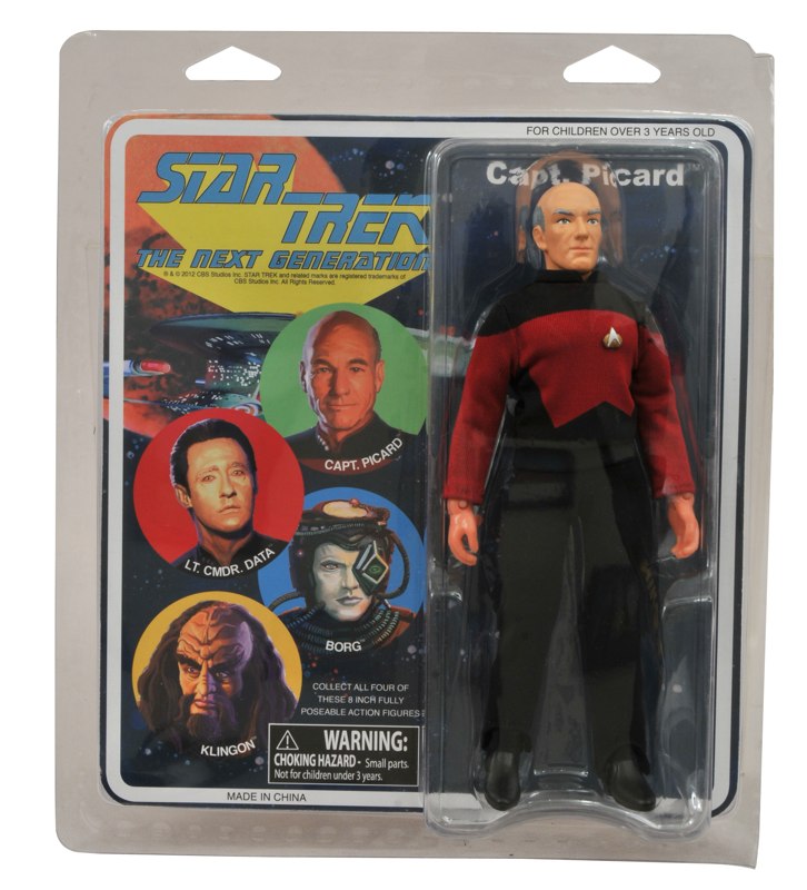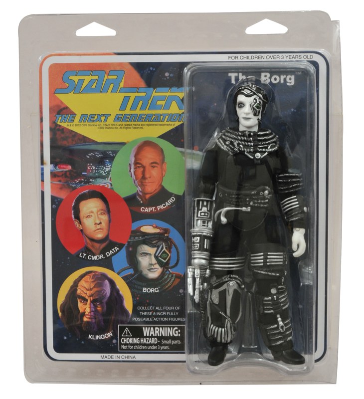 DST's popular Retro Star Trek line - inspired by the classic Mego figures of yesteryear and executed by the boys at EMCE Toys - slingshots forward with its first two characters from "Star Trek: The Next Generation," the Enterprise's Captain Jean-Luc Picard and one of the series' most popular antagonists, a Borg. Each figure features full cloth outfits and stands 8" tall, and each comes packaged in a collector-friendly reusable clam shell package. (SRP: $19.99 each)