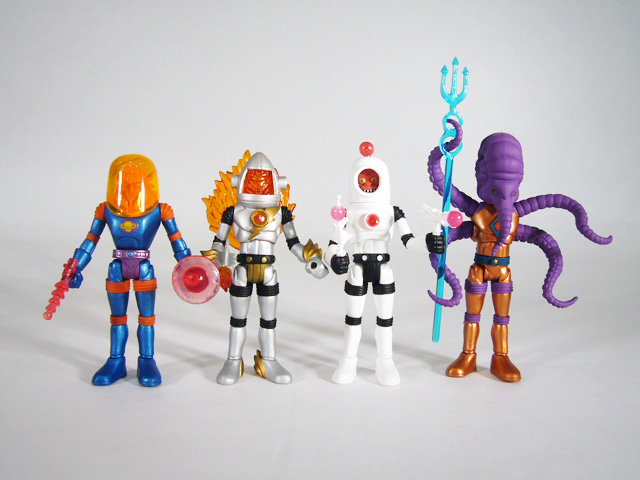 I’m a big fan of the 3 ¾ inch scale and I dig retro sci-fi, so the Outer Space Men are right up my alley. If you’re of a similar mindset you should definitely check them out. They have really interesting designs (no two look alike), solid sculpts, and unique color palettes that further set them apart. They have good articulation (though hinged knees would go a long way) so you can get them in classic attacking poses or have them stand at attention, but with their fun weapons and accessories they’re just asking to be put into battle. The Alpha Phase figures take these design elements another step with their nearly 100% translucent bodies. Unfortunately this obscures their great sculpts, but the figures really do stand out from their fellows. All of the figures seen here are in stock right now at ShopFourHorsemen.com. You can get the Infinity Edition foursome for $50, and the Alpha Phase trio for the same price. Their storefront also has various other Outer Space Men in different colors and decos, so check those out too.