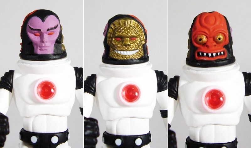 Metamorpho has plenty of “personality” his chest piece has a prominent button, but the big news is that his head has no fewer than three faces! Turn it around to alternate between a scaly reptilian, a space vampire type complete with widow’s peak, and a demonic alien with pointy teeth and huge bug eyes.