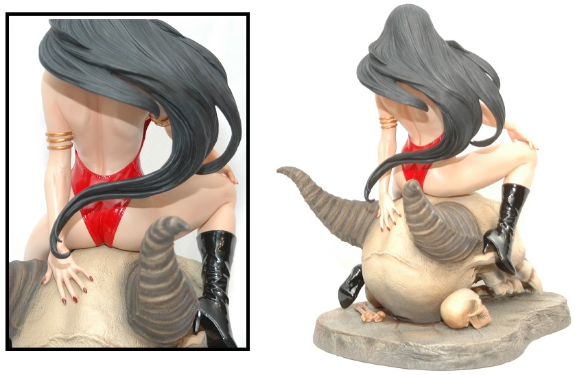 Like other Premium Format Figures, Vampirella too includes multi-media in her construction. The figure's red sling suit is constructed of a faux leather/vinyl-like material and helps make breath life - or death? - into this piece even more. Gidget Earle has done an excellent job fabricating the clothing, which includes the skin-tight red sling suit and black boots. Vampirella truly pops off the comic page and is - as always - bursting at the seams of her outfit. Curvy in all the right places, Vampirella's clothing could be characterized as "barely there," which is no doubt one of the main reasons fan boys love this undead beauty.