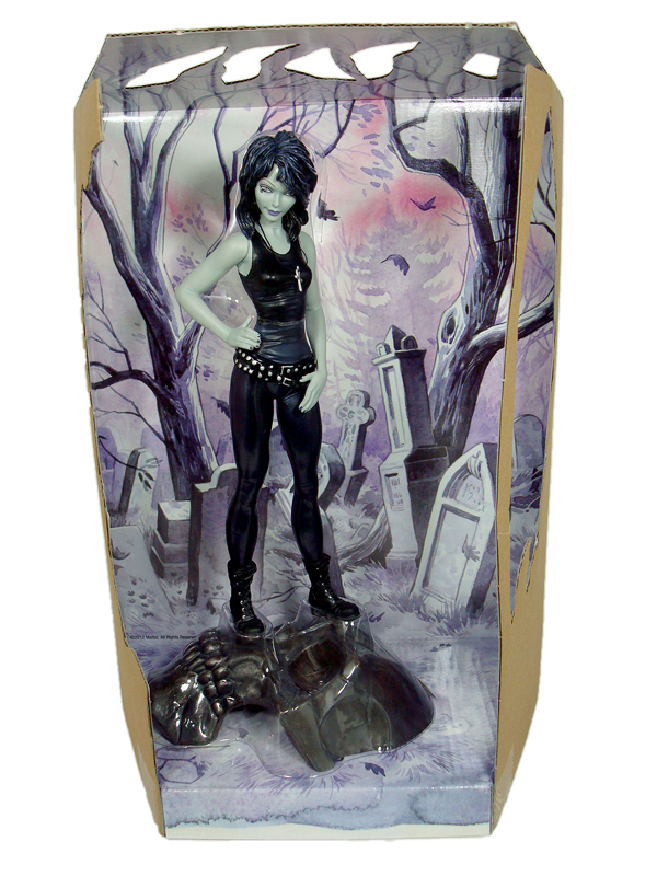 The figure comes packaged in a dioramic window box that is in turn boxed inside an outer shipper all featuring artwork by former Death/Sandman artist Jill Thompson. While not my favorite choice of artwork for Death (as I find her style a little too cartoony) many fans will be thrilled to see a familiar artist lending her talents to the character. The outer box is completely black all-over, but features Death’s face on the front and her ankh symbol on the back. The figure’s box is made to look like a cemetery, with trees on the corners of the packaging and large windows in between. The interior insert continues the theme with a painted backdrop with the figure placed in the middle. The rear of the box features another Jill T. art piece featuring Death in the cemetery.
