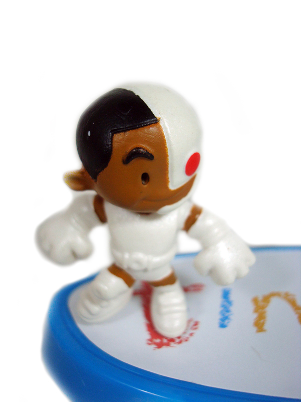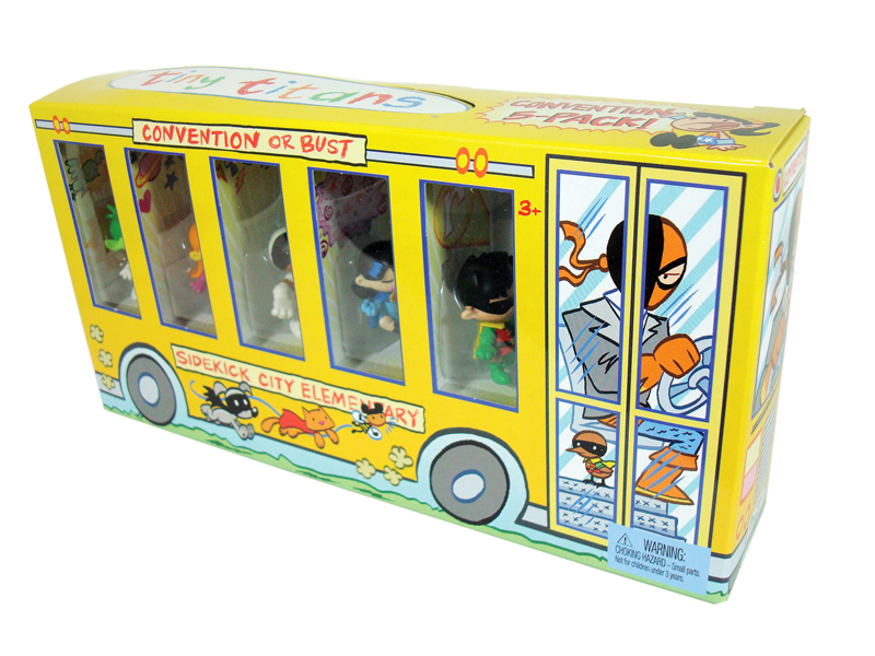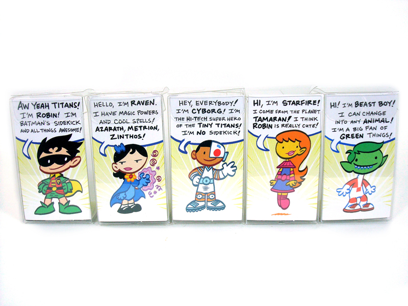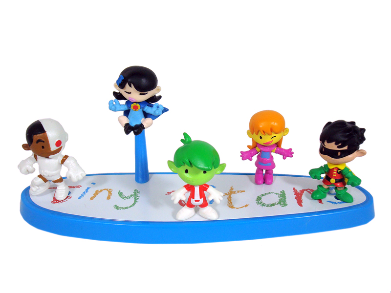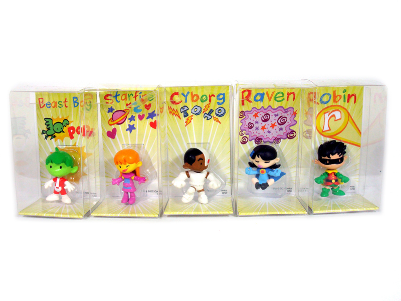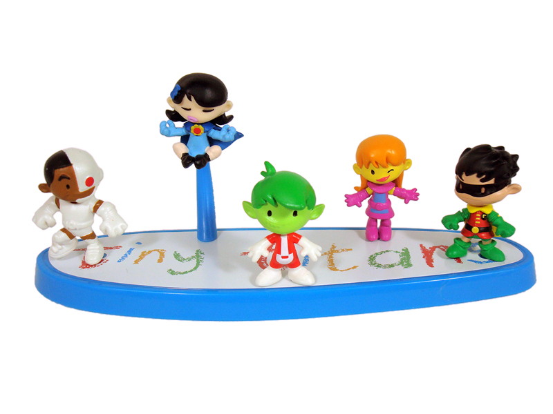 The Tiny Titans collectible figure set features the five main characters Robin, Cyborg, Beast Boy, Starfire, and Raven.
