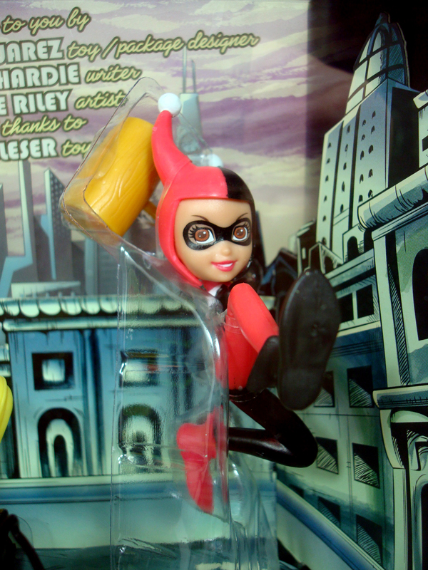 The figures for the most part are pre-posed with very minor to no articulation, but this doesn’t stop them from looking very cool and incredibly cute. The paint is done very cleanly and the details and costumes perfectly convey what character the girl is dressed as. Catwoman’s whip and Harley’s mallet accessories are removable, held on by tiny rubber bands.