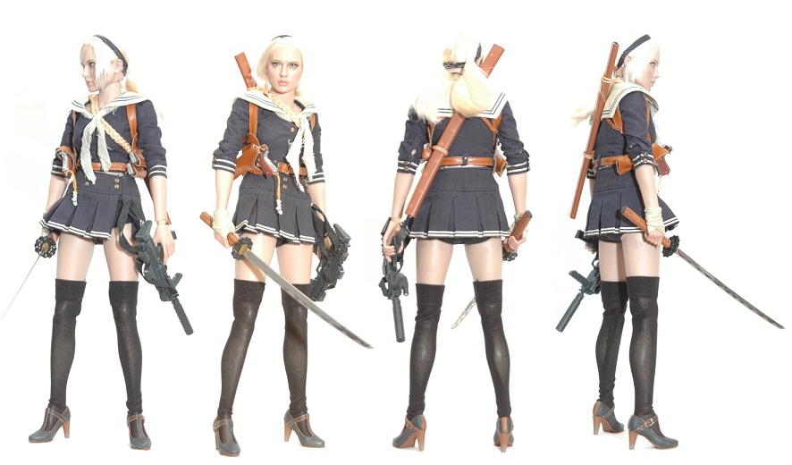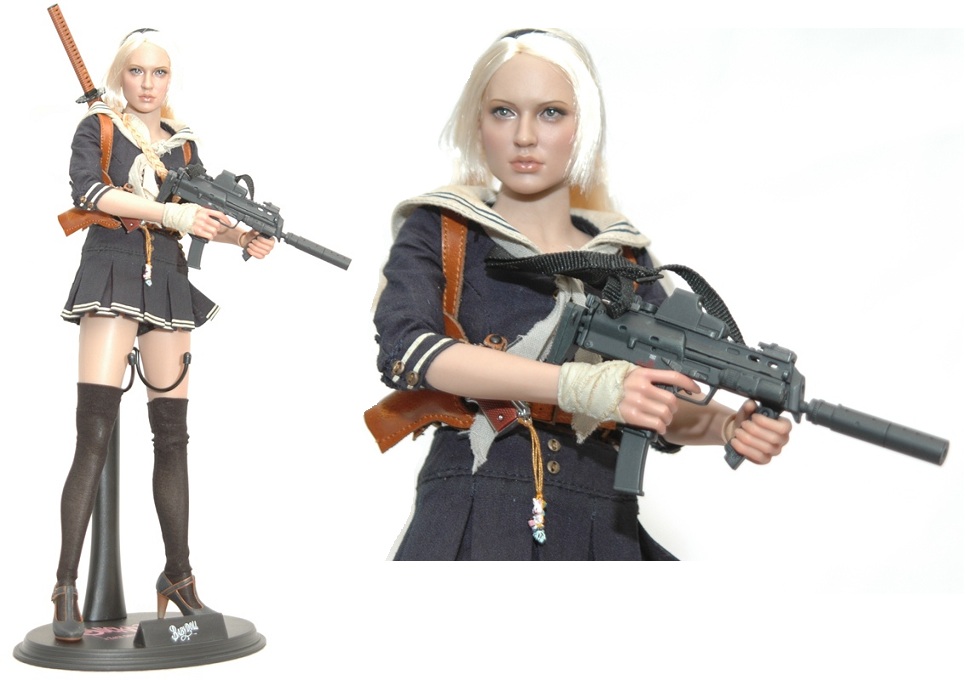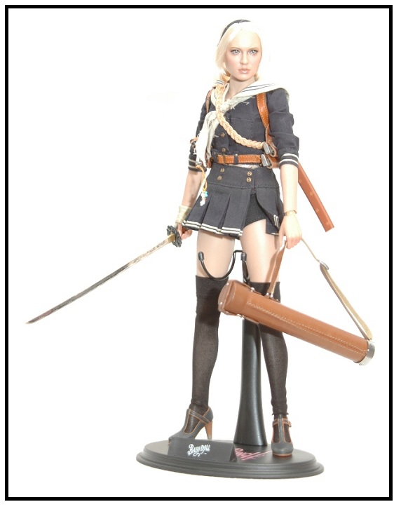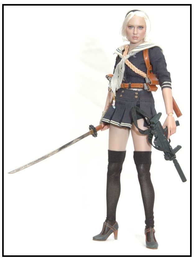 Babydoll, as every school boy’s dream, wears a dark blue sailor-styled shirt, short skirt, black sheer thigh high stockings, and dark blue high heel shoes. Armed for close quarter’s battle, the film’s main character comes armed with a .45 ACP pistol, a Japanese-style samurai sword with sheath, and a clip-fed sub-machine gun with silencer. Babydoll also includes a map case with strap, a radio headset, multiple ammunition magazines for her two firearms and a key on a chain. Screen-accurate and impressive in their minute details, the accessories here help complete the figure’s overall look.