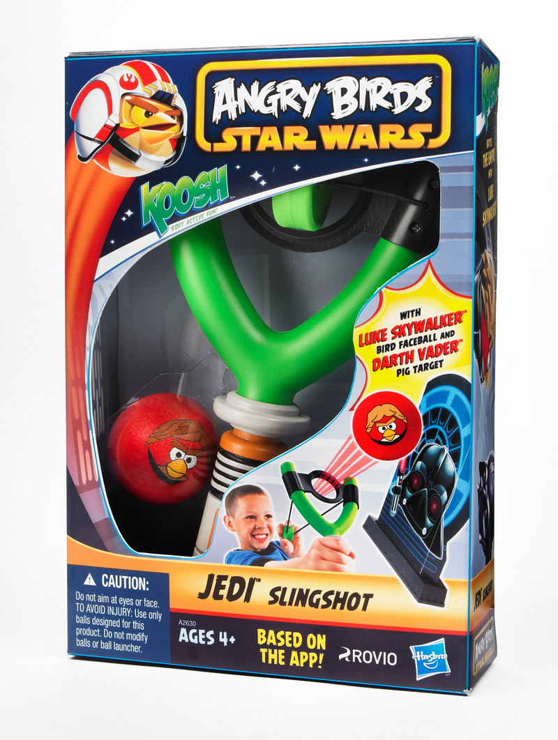 Kids can ‘use the Force’ and transform into heroic Jedi Knights with the easy-to-use KOOSH ANGRY BIRDS STAR WARS JEDI Slingshot. With one swift pull and release of the sling, they can launch the LUKE SKYWALKER Bird Faceball at the DARTH VADER Pig target. Comes complete with one LUKE SKYWALKER Bird Faceball and one DARTH VADER Pig target. Approximate Retail Price: $14.99