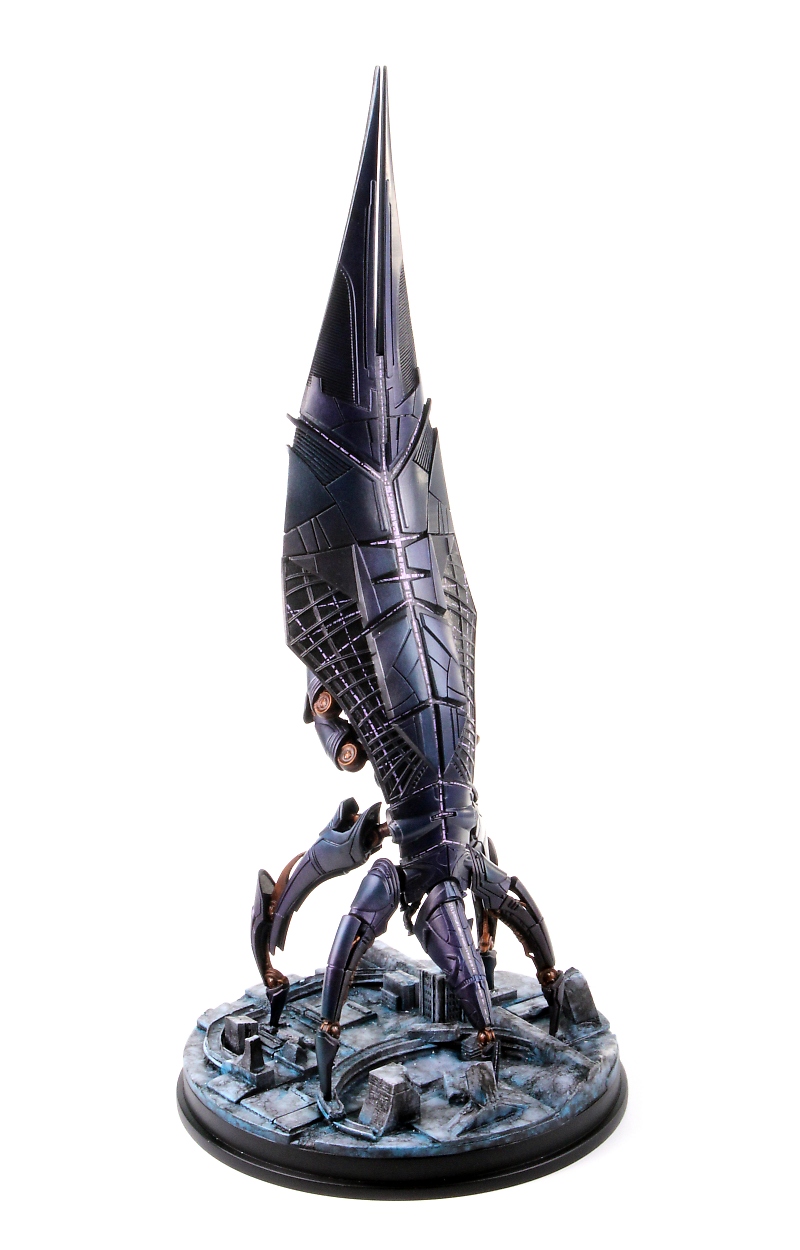 This craft is the flagship of the rogue Spectre Saren Arterius. Responsible for leading a devastating attack on the Citadel in the original Mass Effect game, Sovereign is an enormous sentient dreadnought larger than two kilometers in length. The Dark Horse re-creation of Sovereign also has a sculpted base depicting a devastated city and planetary surface to convey its huge scale.