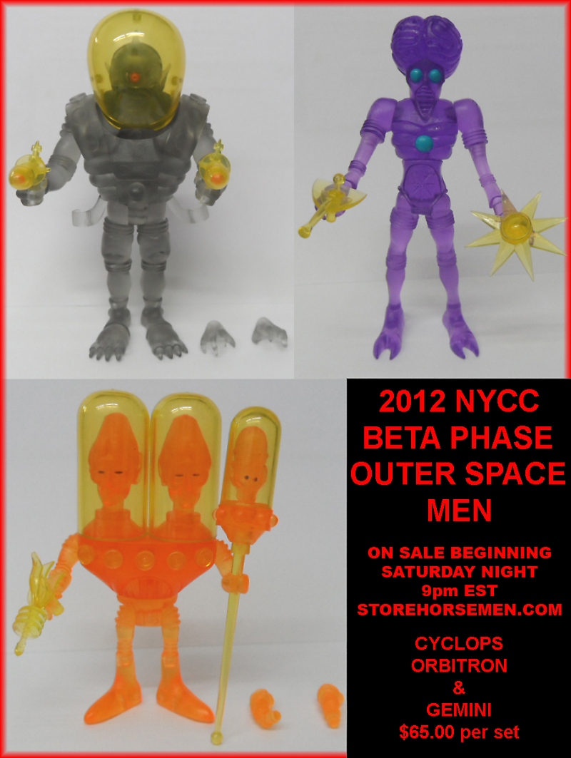 A heads up that the Outer Space Men that were previously a shared 2012 New York Comic Con exclusives between Toy Tokyo and Action Figure Xpress go up for sale in VERY limited quantities tomorrow night at 9pm on the Four Horsemen's online retail outlet - Store Horsemen (storehorsemen.com).