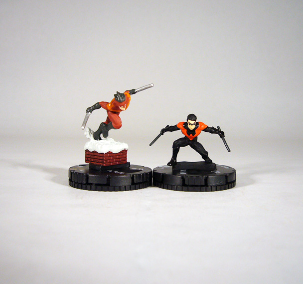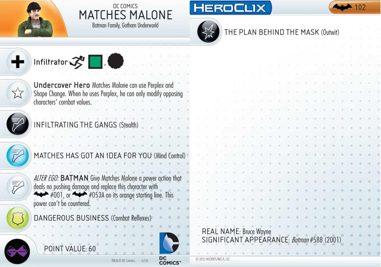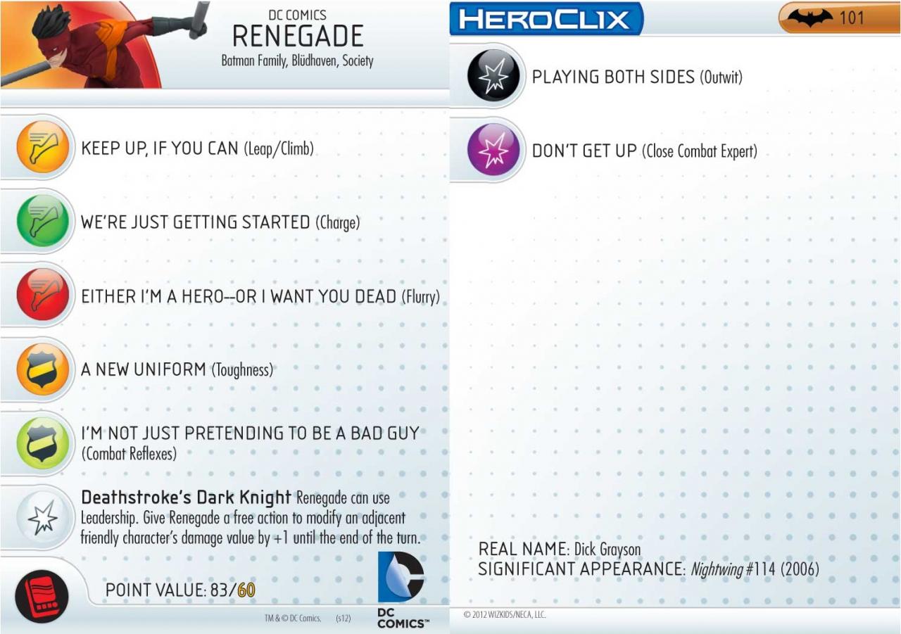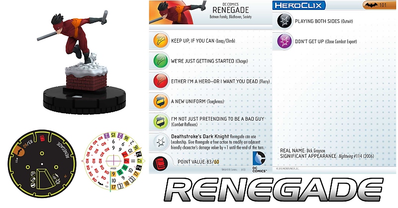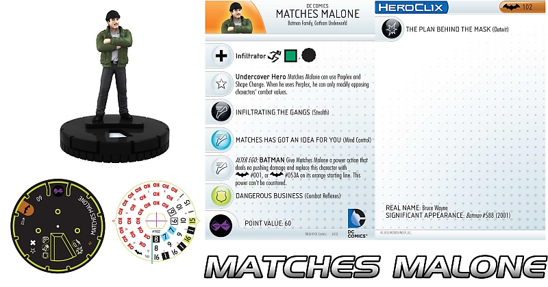 The dials and powers of these figures are as distinctive as their back stories and appearances. Matches is a 60 point Alter Ego figure (able to transform into either 001 Batman or 053A Batman) with plenty of tricks up his sleeve from Improved Movement (hindering and figures) to the Underworld team ability, and a trait granting Shape Change and Perplex against opposing figures. Malone has Outwit for three clicks, Stealth at the outset then two clicks of Mind Control, mid-dial Combat Reflexes, and the Alter Ego power on his last two clicks. Finally, Batman Family and Gotham Underworld keywords provide two very different team building options. Renegade has a lot of the usual powers and abilities you’d expect from Nightwing with Indomitable, 6 range, Leap/Climb then Charge with Toughness, some mid-dial Flurry and Outwit, back half of the dial Combat Reflexes, and closing Close Combat Expert. As a villain Grayson has the Calculator team ability, but he’s still an exceptional leader with two opening clicks of a special power granting Leadership and a +1 modification to a friendly character’s damage as a free action. Notably, this preview of Renegade marks him as an Alter Ego figure, which theoretically means we’ll be seeing a Dick Grayson figure in the Batman set!