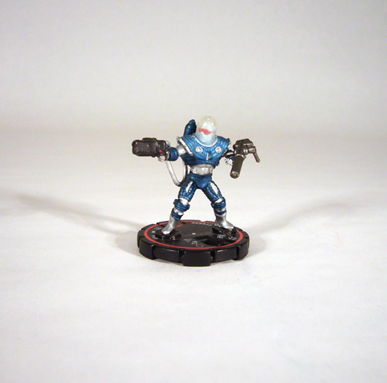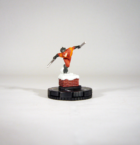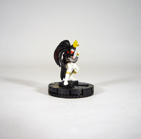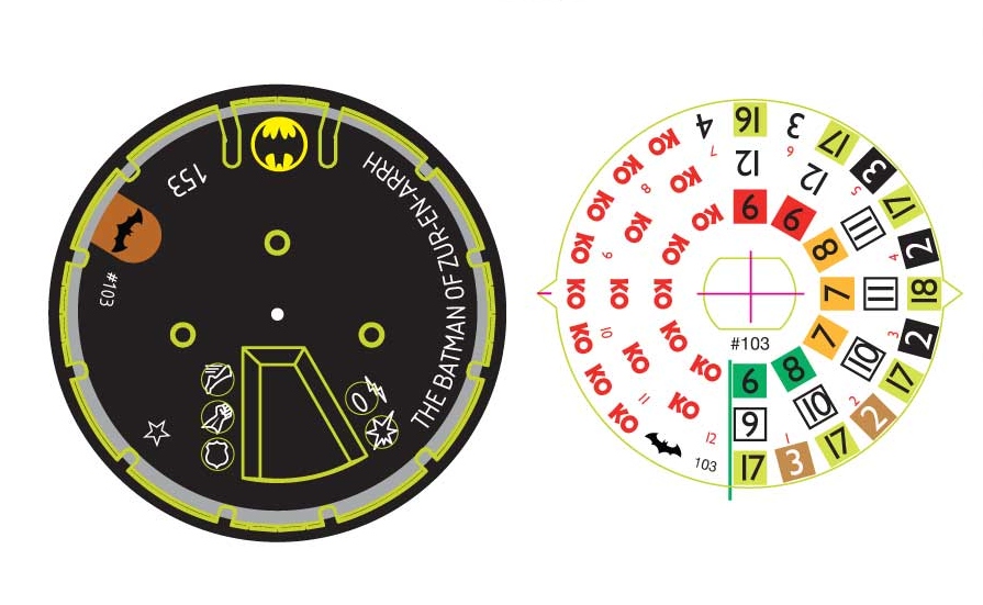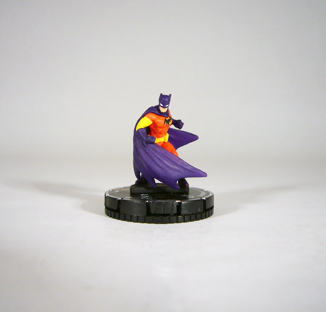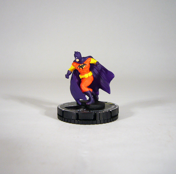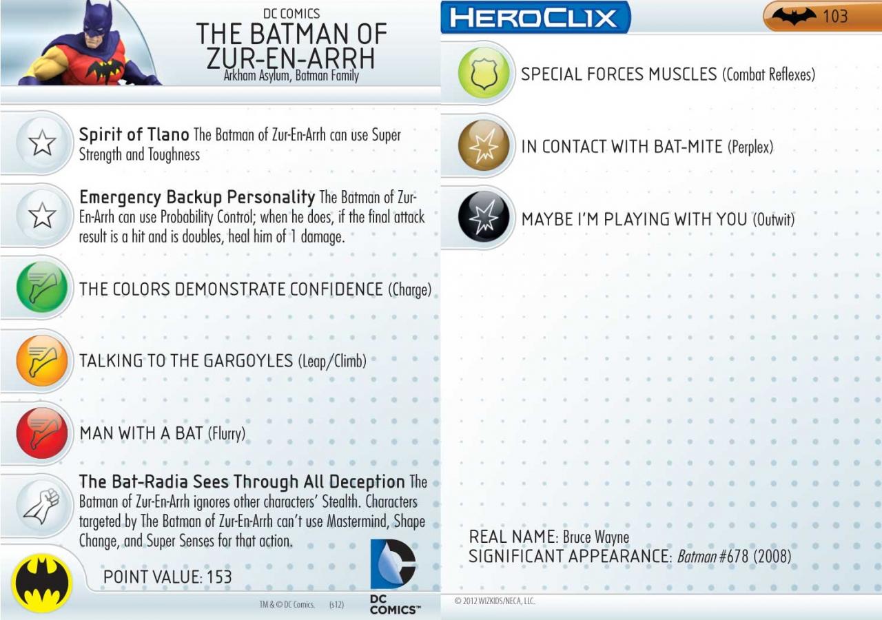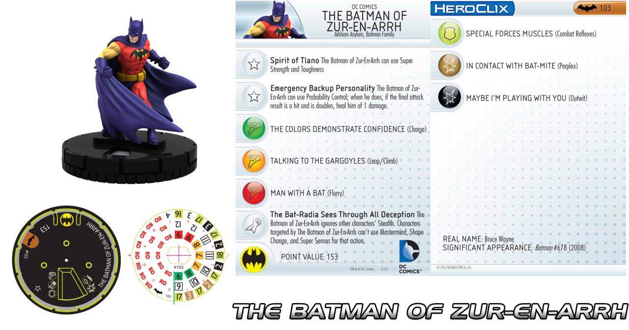 The Batman of Zur-En-Arrh is a unique 153 point Batman Ally figure with not one but two traits: “Spirit of Tlano” lets him use Super Strength and Toughness while “Emergency Backup Personality” gives him Probability Control that heals him when the re-rolled result is a hit with doubles! His dial is packed with powers but pretty straightforward. He starts with two clicks of Charge, then three with Leap/Climb, and finally two clicks of Flurry. The first five clicks of his ever-rising attack have the special power “The Bat-Radia Sees Through All Deception” that ignores other characters’ Stealth and prevents his targets from using Mastermind, Shape Change, or Super Senses! For defense this Batman has a full dial of Combat Reflexes, and in the damage slot two opening clicks of Perplex and then three clicks of Outwit.