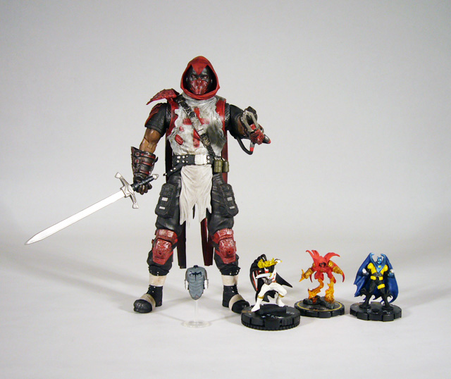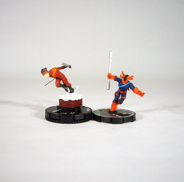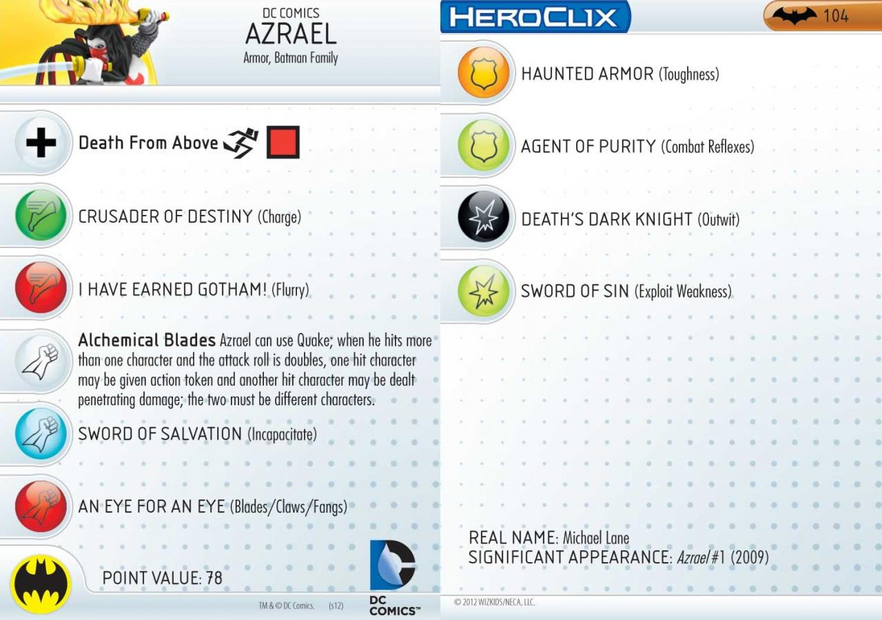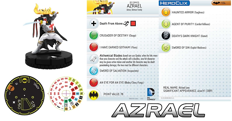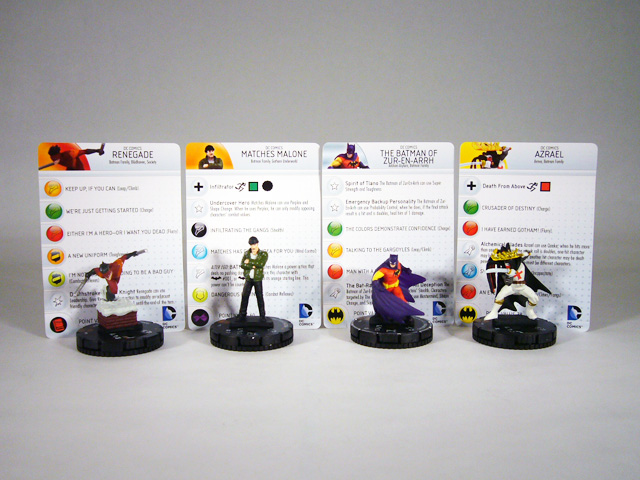 Intended to promote HeroClix through in-store tournaments and giveaways, the Batman OP kit is only available to venues and includes multiple copies of four figures, three objects, and a new double-sided map (you can’t get any of these anywhere else). Since it’s a Batman set, it should come as no surprise that the prize figures are made up of Bruce Wayne identities as well as some of his allies. Coming to stores next month are Dick Grayson as Deathstroke’s sidekick Renegade, Bruce Wayne in his undercover disguise as Matches Malone, Bruce Wayne as The Batman of Zur-En-Arrh, and Michael Lane’s Azrael! A very interesting mix, this kit gives players the first ever HeroClix versions of Zur-En-Arrh Batman, this Azrael, and Renegade, while updating Matches for the current tournament scene.