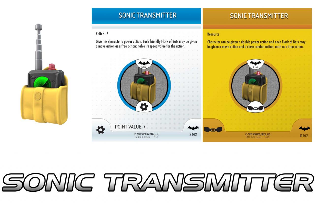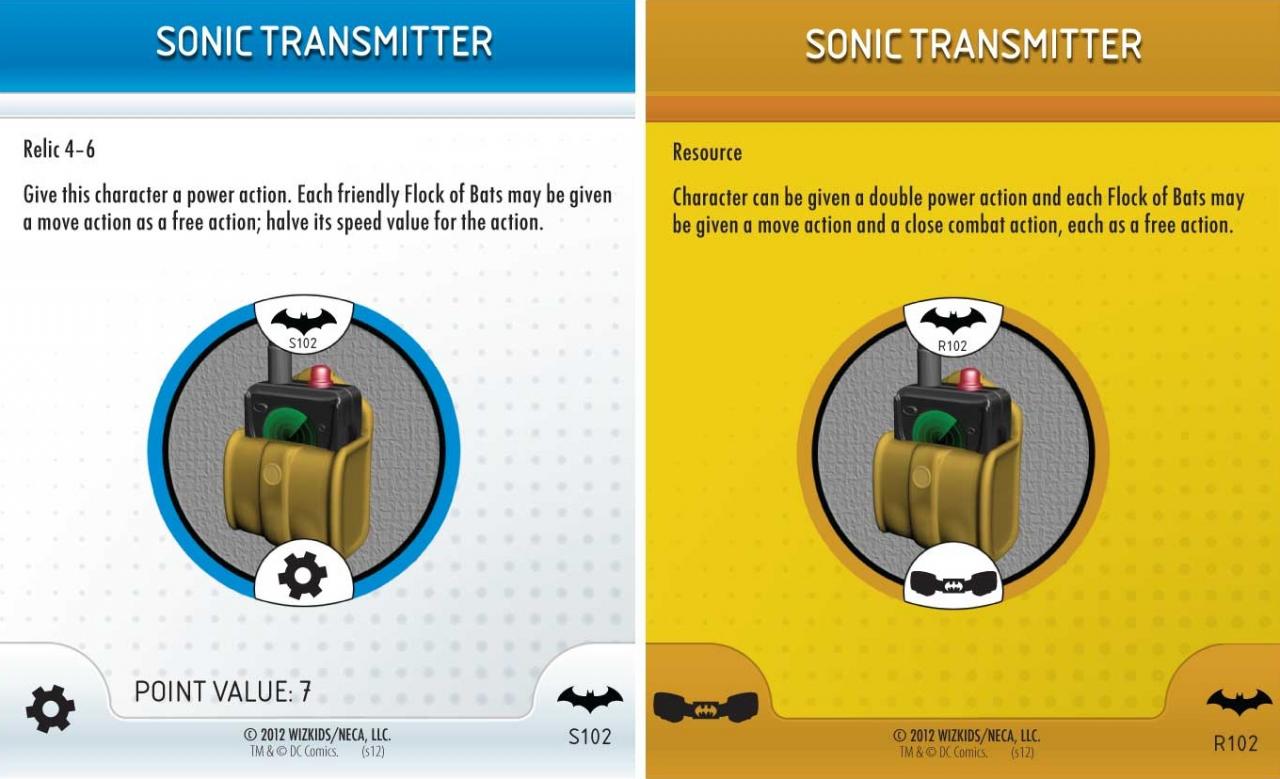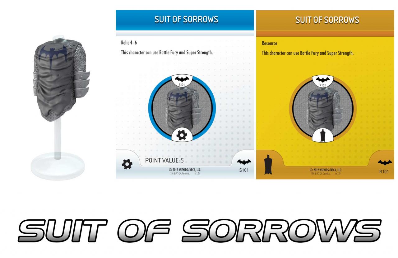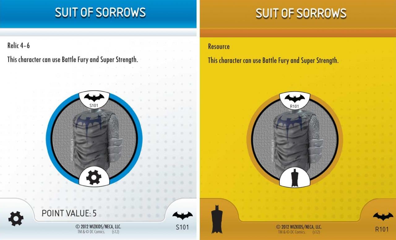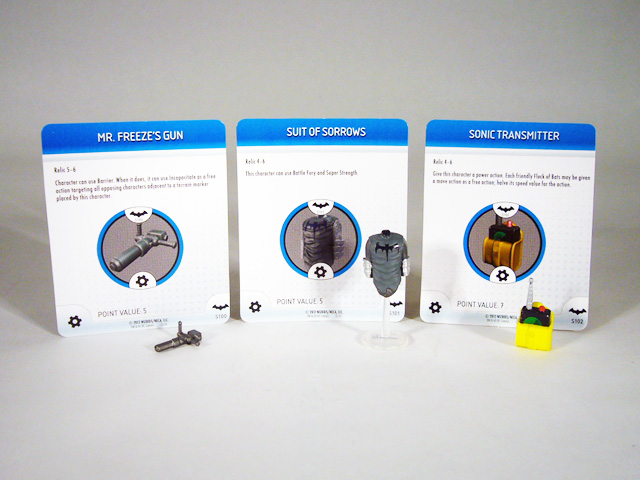 While most previous OP kits have had two different objects, the Batman version comes with three! Mr. Freeze’s Gun is a 5 point relic captured in 3D form as a complex silver gun with two handles. Any character that successfully picks up the Gun can use Barrier, and when it does it can follow up with Incapacitate targeting all opponents adjacent to a Barrier marker. Next up are two items that can be used on their own or in conjunction with the Utility Belt from the upcoming No Man’s Land event. In regular play the Sonic Transmitter is a 7 point relic that looks like a sonar or radar scanner tucked into a yellow utility belt pouch. Any character that picks it up can be given a power action to give a move action (as a free action) to each friendly Flock of Bats with half speed. As a resource attached to the Utility Belt the Transmitter activates on a double power action and gives each Flock of Bats a move action AND a close combat action, each as a free action. Finally, Azrael’s Suit of Sorrows is a 5 point relic appearing as chainmail armor covered by a bat symbol-emblazoned tabard on a small clear stand. As a standalone object it can be picked up, giving a character Battle Fury and Super Strength. Placed in the Utility Belt costume slot the Suit offers the same benefits.