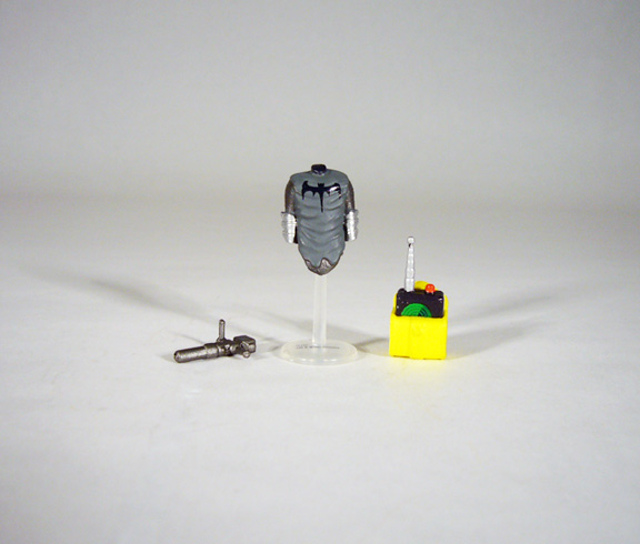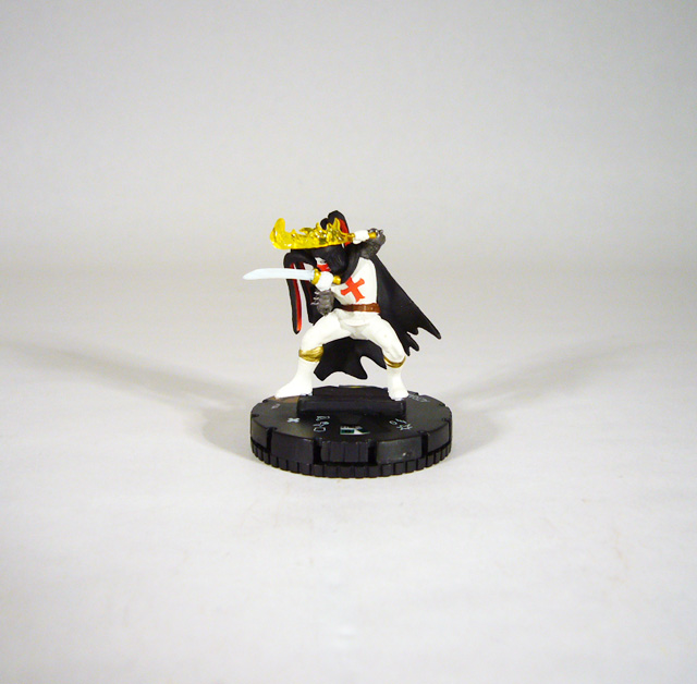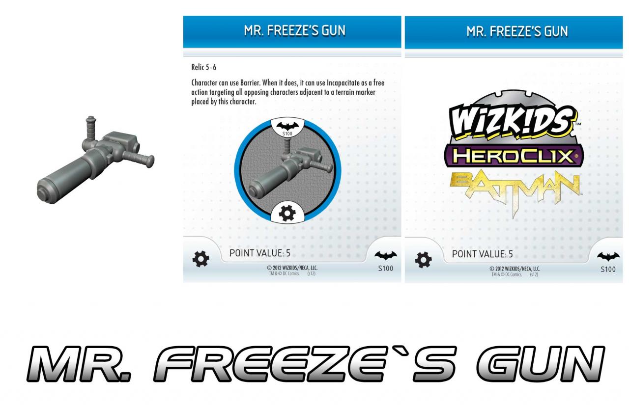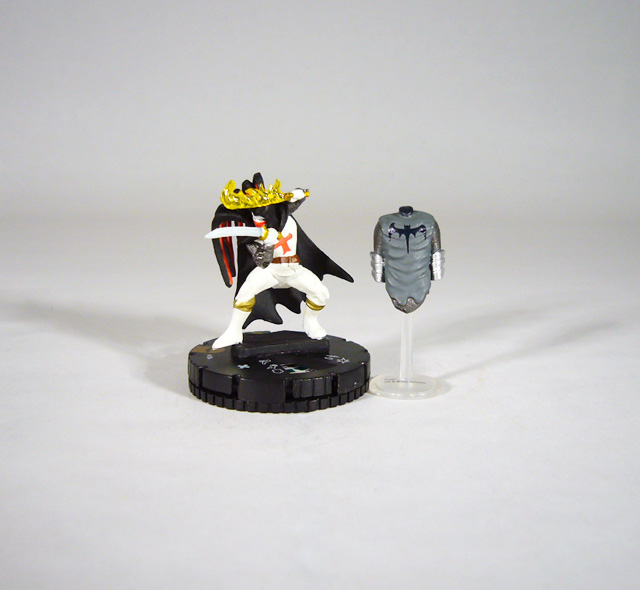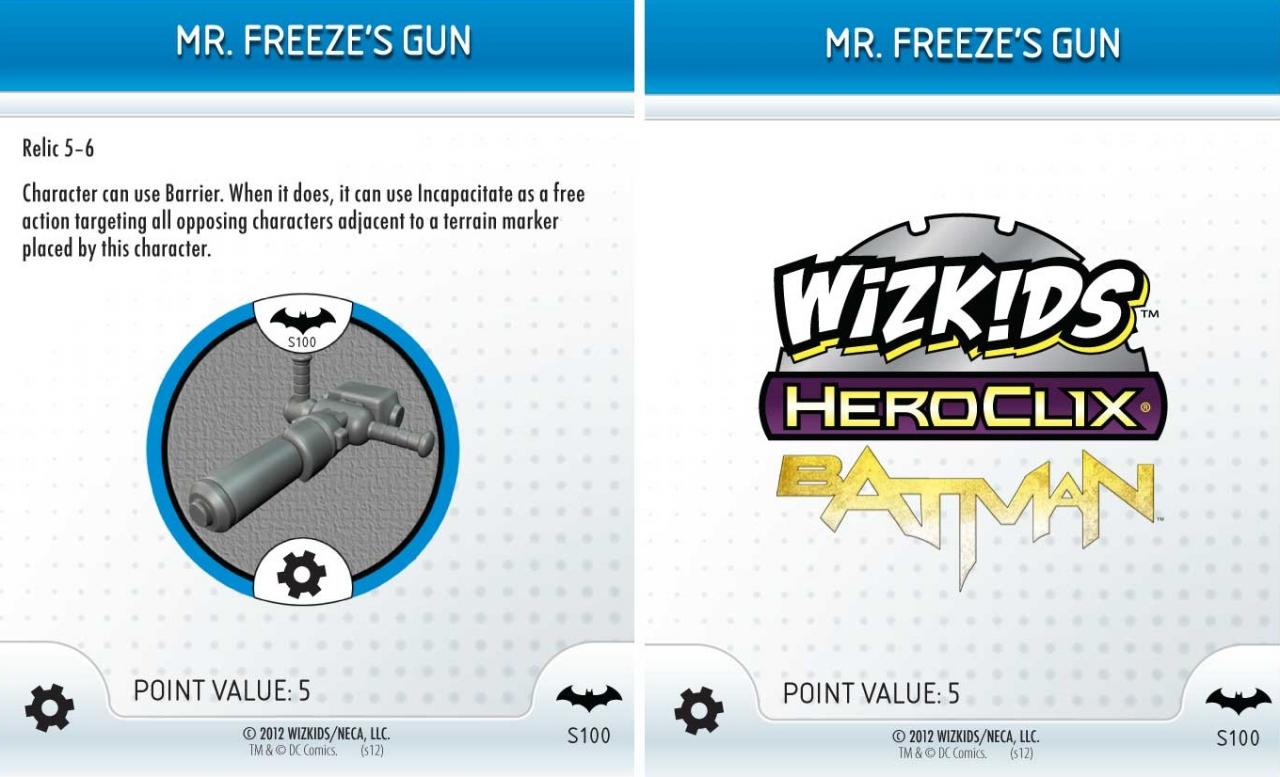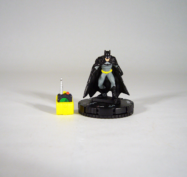 While most previous OP kits have had two different objects, the Batman version comes with three! Mr. Freeze’s Gun is a 5 point relic captured in 3D form as a complex silver gun with two handles. Any character that successfully picks up the Gun can use Barrier, and when it does it can follow up with Incapacitate targeting all opponents adjacent to a Barrier marker. Next up are two items that can be used on their own or in conjunction with the Utility Belt from the upcoming No Man’s Land event. In regular play the Sonic Transmitter is a 7 point relic that looks like a sonar or radar scanner tucked into a yellow utility belt pouch. Any character that picks it up can be given a power action to give a move action (as a free action) to each friendly Flock of Bats with half speed. As a resource attached to the Utility Belt the Transmitter activates on a double power action and gives each Flock of Bats a move action AND a close combat action, each as a free action. Finally, Azrael’s Suit of Sorrows is a 5 point relic appearing as chainmail armor covered by a bat symbol-emblazoned tabard on a small clear stand. As a standalone object it can be picked up, giving a character Battle Fury and Super Strength. Placed in the Utility Belt costume slot the Suit offers the same benefits.