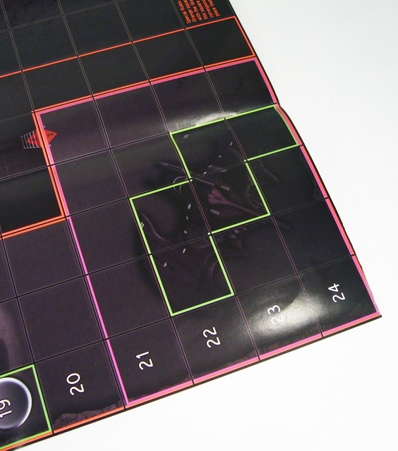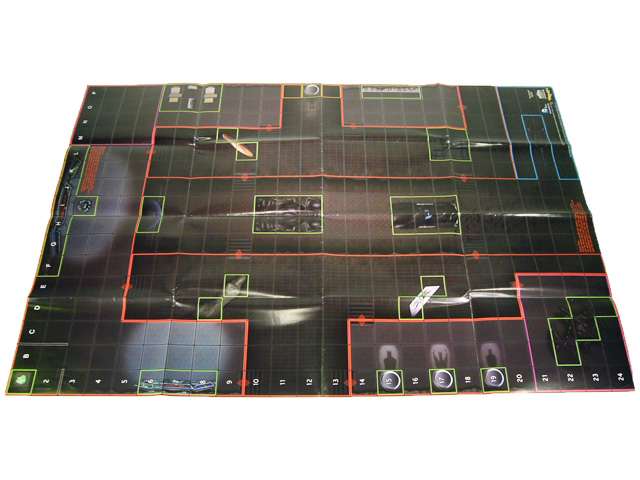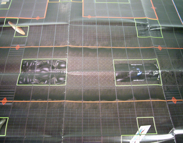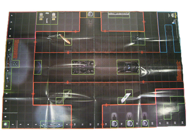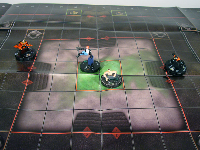 Last up, of course, are the OP kit maps. You’ve asked for it, and WizKids has delivered: the first is the Batcave! An indoor map, the cave has a long central corridor with hindering terrain Batmobiles flanked by increasing elevations on the sides and at one end. The map is littered with vehicles and classic Batcave references including a Batboat in a corner of water terrain, Batplane, a hall of costumes, Batcomputer, medical bay, equipment room, giant penny and Joker card, T-Rex, and more! Teams start in opposite level 3 corners, one at the Batplane and the other adjacent to the computer. Flyers and figures with Leap/Climb or Improved Movement (like many members of the Batman Family) will have no trouble traversing the multiple elevation changes to get to their opponents. There are also two orange squares of special “Bat-pole” terrain; if you’re playing with the Wayne Manor map as well a character in one of those squares can be given a power action to use the pole and relocate there.