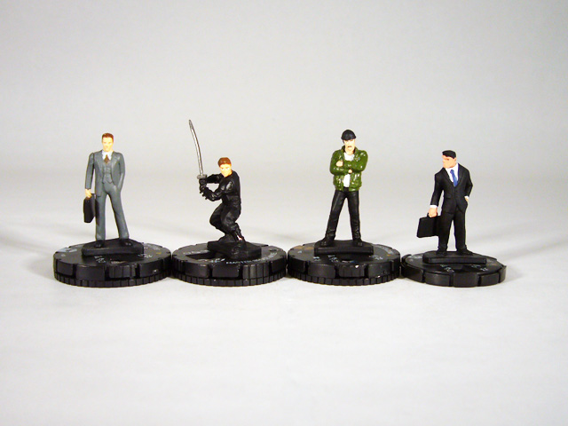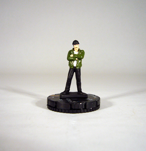 As varied as the characters are, their looks are even more interesting. Working for Deathstroke, Grayson adopted a red and orange version of his Nightwing costume, complete with dark gray gloves and boots and equipped with his familiar Eskrima sticks. WizKids brings back the Nightwing sculpt from the DC 10th Anniversary set for this figure, but swaps out his head for a new one outfitted with a mask and long, flowing hair. The dynamic roof-leaping sculpt looks just as good in this color palette. Matches Malone, the identity Wayne uses to infiltrate the criminal element, is for all intents and purposes just a shady looking character. His figure is a repaint of the Hired Goon (previewed as part of the Batman primer gravity feed), a typical tough wearing heavy clothing with his arms crossed menacingly. Malone switches up the outfit with black pants, a green jacket, and white shirt, while the vigilante stands out with his distinctive moustache - perfect for blending in with Gotham’s worst!