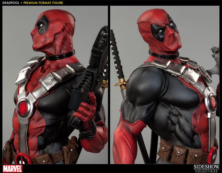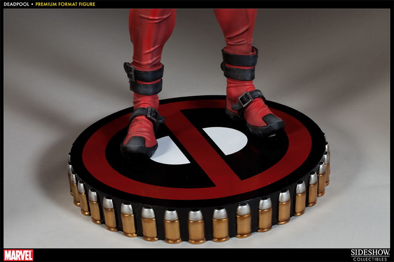 After numerous teasers, Sideshow today fully unveils their Deadpool Premium Format Figure... and has opened pre-orders. Priced at $349.99 (with payment plan available) and shipping in June 2013, fans will want to get their orders in now for the Sideshow Exclusive Deadpool PFF which includes a switch-out hand holding a rubber chicken... stuffed with dynamite! Standing at 20 inches in overall height on a base ringed with bullets, the Deadpool PFF (regular and exclusive) also features two interchangeable heads for alternate display.