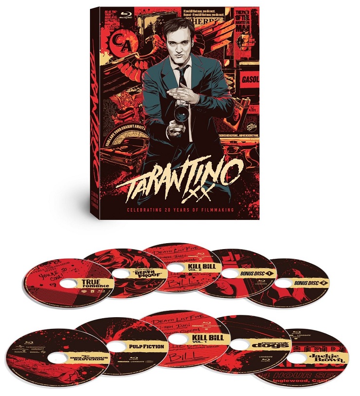 Jump ahead to today and the recently released Tarantino XX 8-Film Collection. Comprised of one film written by Tarantino (True Romance) and seven films both written and directed by the talent, this 10 disc blu-ray set includes a majority of the director's repertoire, including 1992's Resevoir Dogs, 1993's True Romance, 1994's Pulp Fiction, 1997's Jackie Brown, 2003's Kill Bill Vol. 1, 2004's Kill Bill Vol. 2, 2007's Death Proof (one part of the Grindhouse double-feature with Robert Rodriguez), and 2009's Inglourious Basterds.