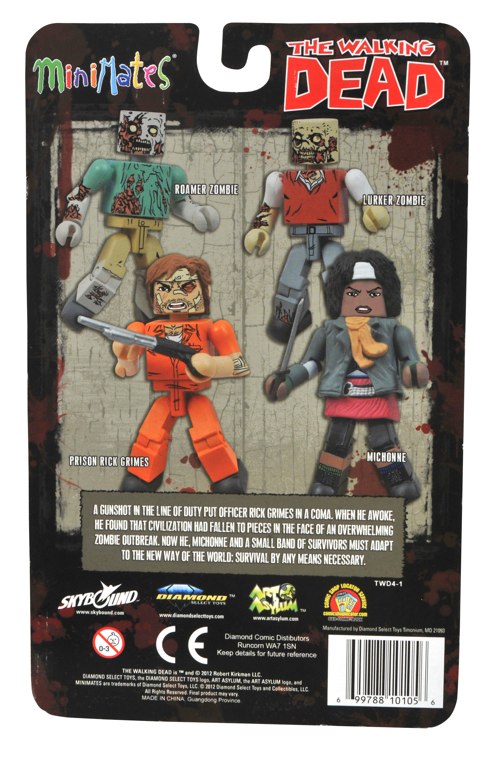 Diamond Select Toys and Amazon.com have teamed up to offer an exclusive four-pack of Walking Dead Minimates, taken straight from the hit comic book series by Robert Kirkman. The set includes two new zombies, a Roamer and a Lurker, plus all-new versions of Michonne (with angry expression) and Rick Grimes (in prison garb, with battle damage).