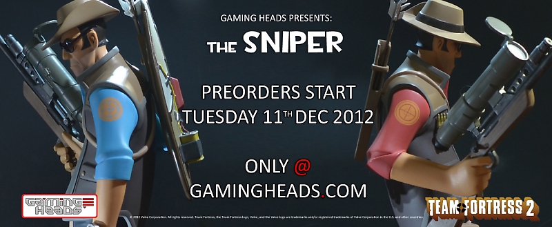 Gaming Heads continues to represent the characters of Team Fortress 2 in fine statue form with their latest release: The Sniper. Following Heavy, Medic and The Soldier, The Sniper will be offered in both Team Red and Blu colors. Full details tomorrow - 12-11-12 - when pre-orders open up exclusively at GamingHeads.com.