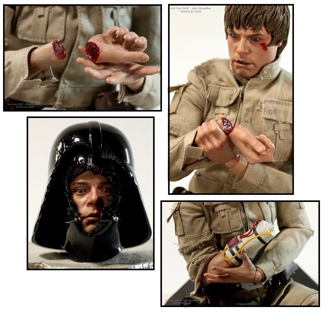 Considering the impressiveness of the head sculpts, the accessories and other minor sculpted details are also impressive and well worth noting. This includes Luke's blaster, multiple light sabers (both lit and unlit), multiple hands sculpts, the severed hand/stump, and the auto-tourniquet. One of the coolest accessories to also be included in a recent Hot Toys release is the severed "Luke Skywalker as Darth Vader" head from the film scene on Dagobah (above). Available exclusively in limited set, this head is simply another minor detail with a major impact that has fans clamoring for the hard-to-find and sold out limited edition version of this figure.