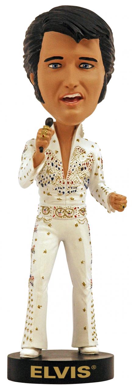Royal Bobbles, a premium bobblehead company specializing in historic figures, presents their latest head bobbing icon: Elvis "Aloha in Hawaii". Officially licensed by Elvis Presley Enterprises, this exquisitely painted bobblehead of "The King" comes just in time for the 40th anniversary of that groundbreaking show - "Aloha in Hawaii" being the first concert broadcast globally via satellite. Just check out all those "rhinestones"!