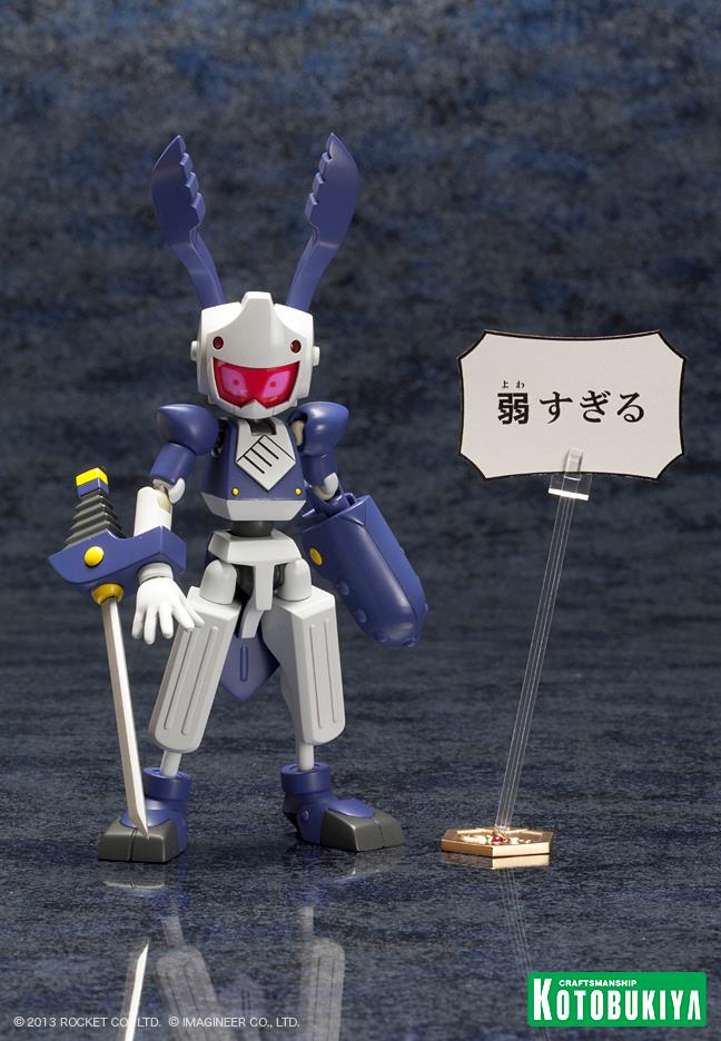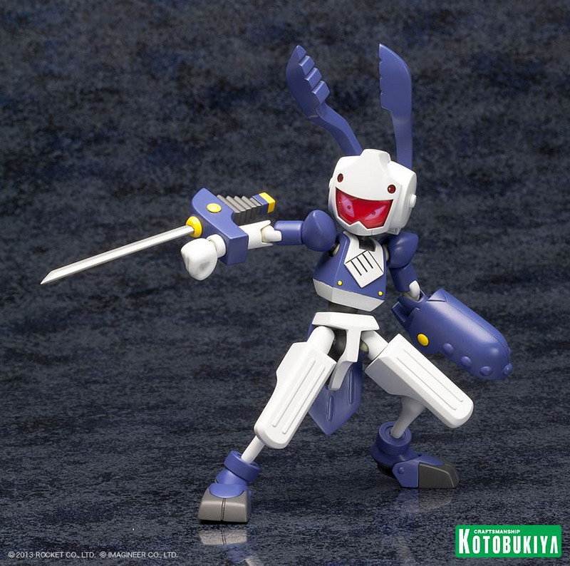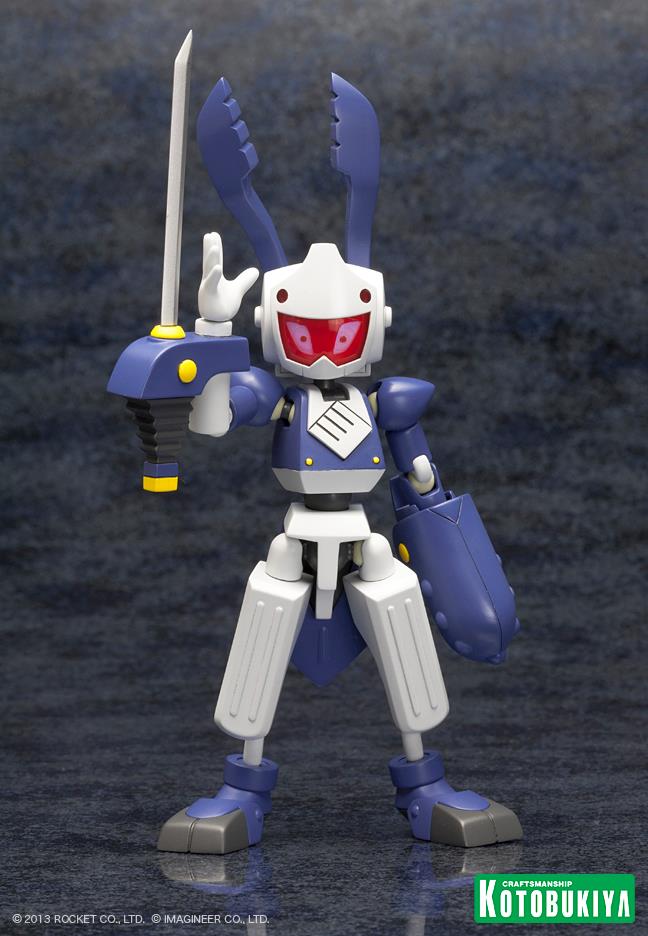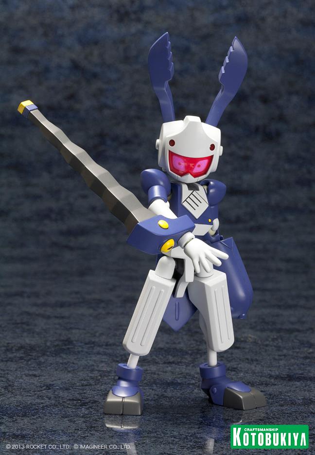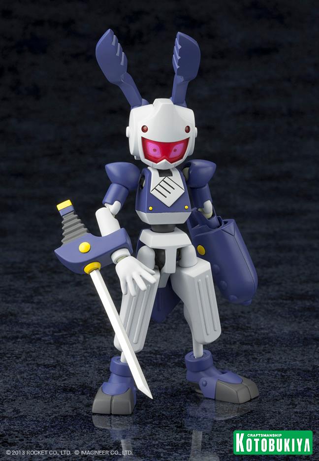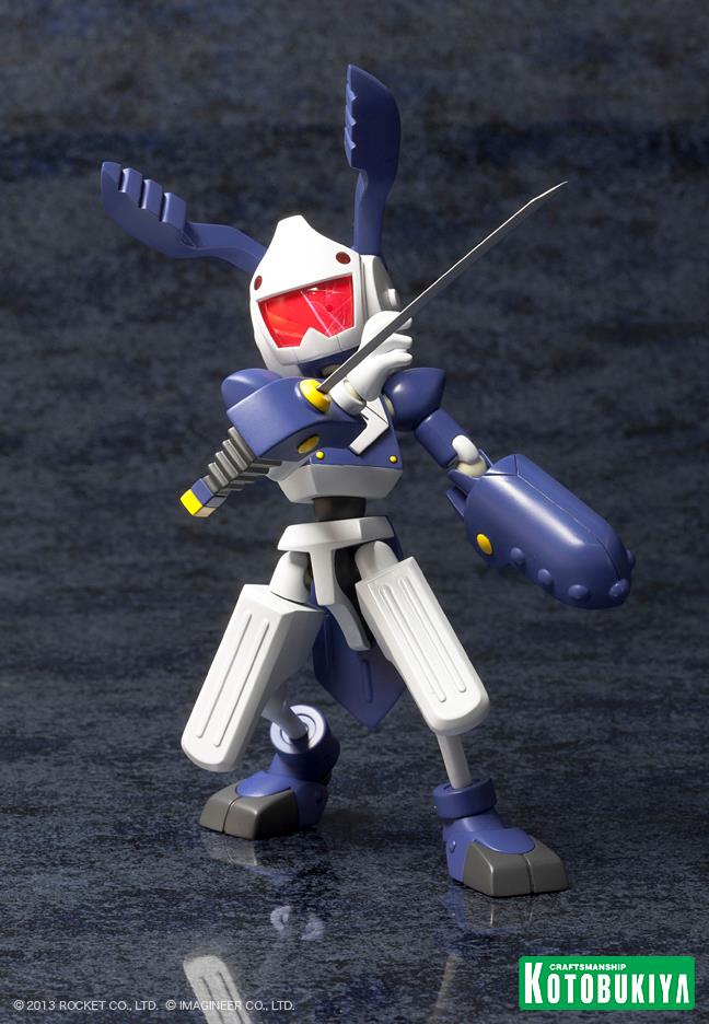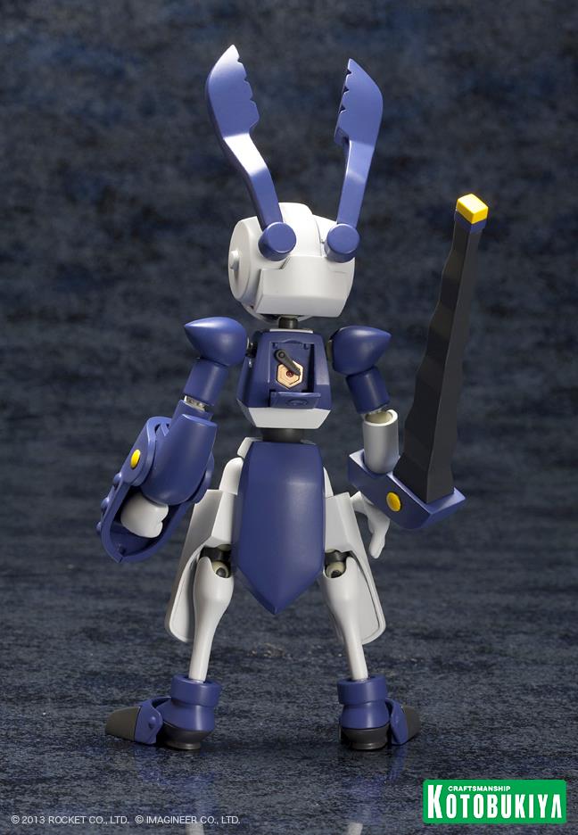 Sanjuro resembles a samurai stag beetle (though he looks more like a rabbit to me). Sanjuro comes pre-colored and its snap-fit assembly requires absolutely no glue. The robot is comprised of 160 parts, and when put together has multiple points of articulation. Standing nearly 6 inches tall (1/6 scale), Sanjuro is the perfect companion to the previously released Metabee (pictured below) and Rokusho.